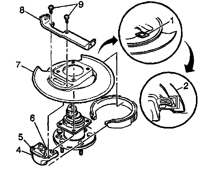 3. Position the park brake shoe. actuator (4), and backing plate (7) over the rear hub.