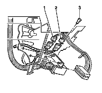 6. Remove the connector position assurance (CPA) (3) from the steering wheel module coil yellow 4-way connector (2) located at the base of the steering column.