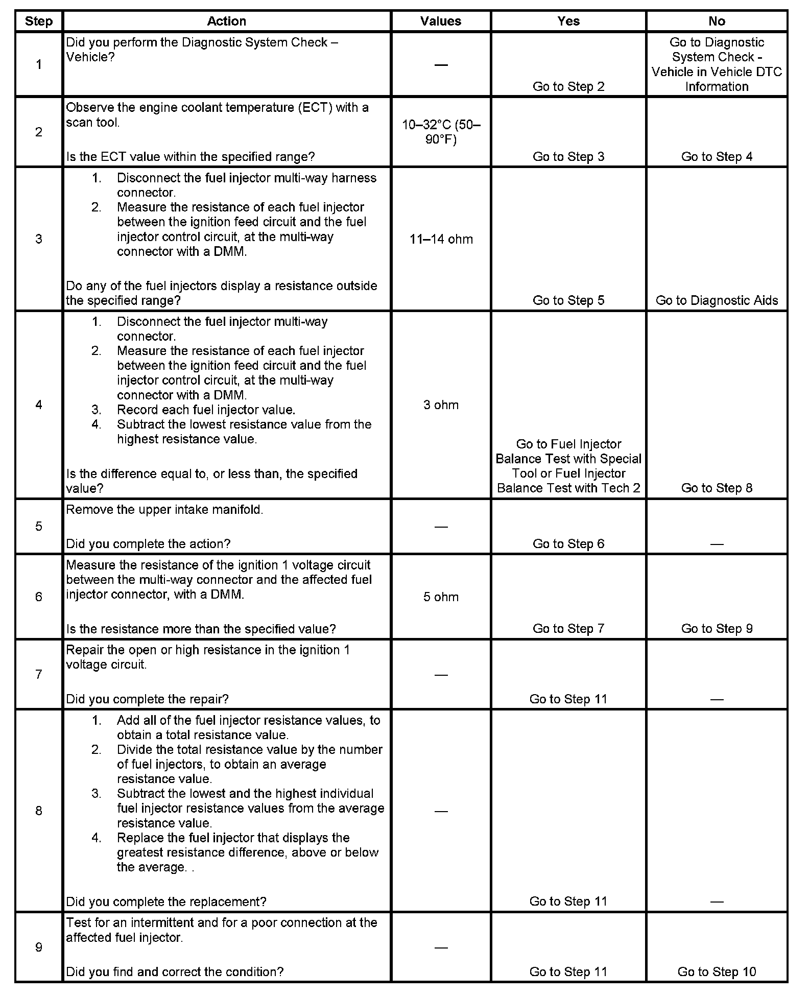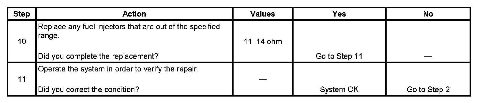3. This step tests each fuel injector resistance within a specific temperature range. If any of the fuel injectors display a resistance outside of the specified value, replace the fuel injector.