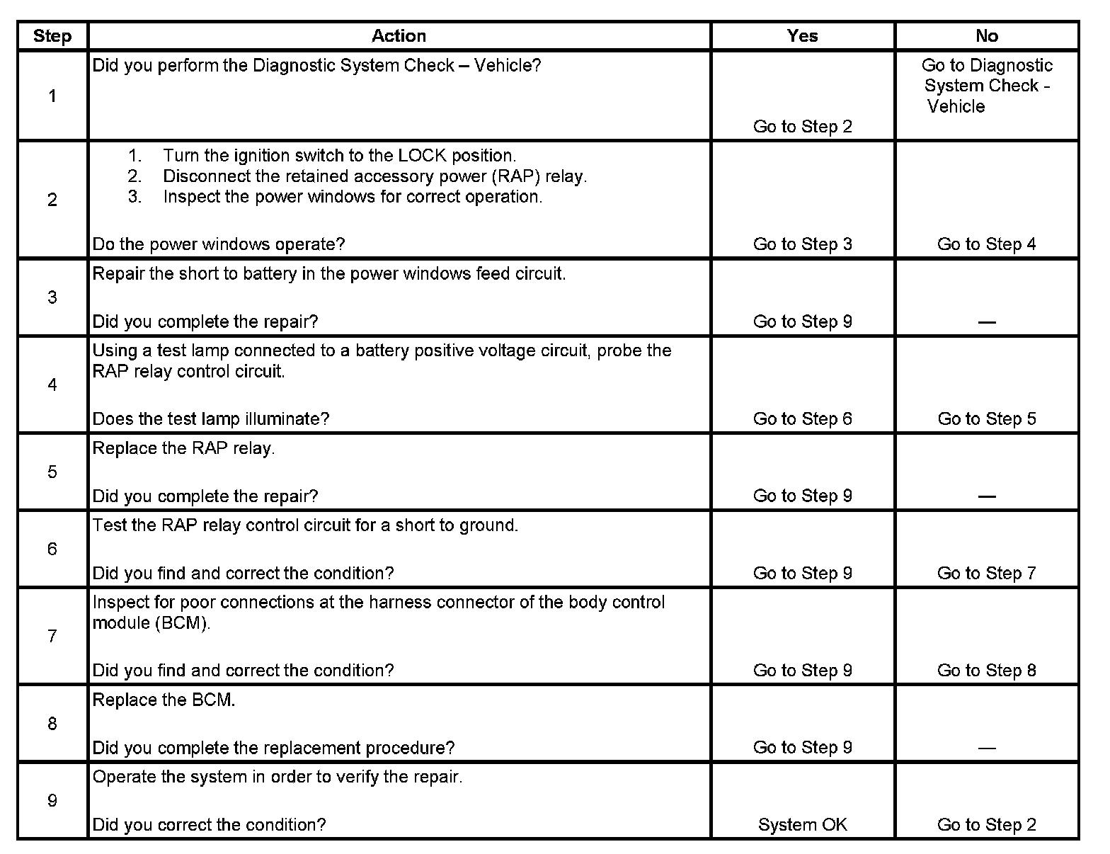 If the power windows operate properly under retained accessory power (RAP) conditions and the radio or vehicle interface unit (VIU) do not operate properly, the condition exists in the class 2 circuit of the radio, VIU, or instrument panel cluster (IPC), or one of the individual modules. Refer to Scan Tool Does Not Communicate with Class 2 Device. Testing and Inspection
