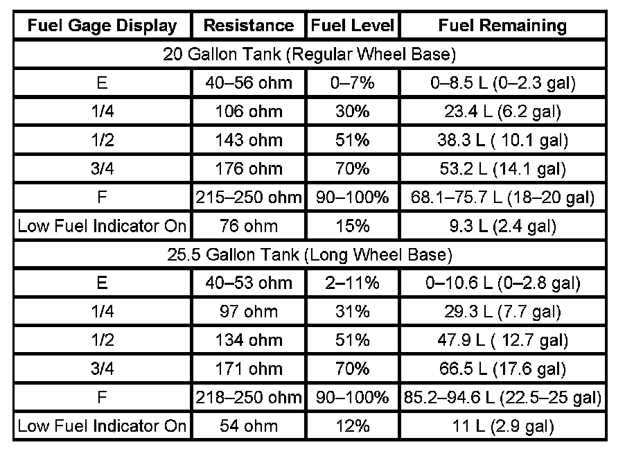 The information in this table is intended for use with the J 33431-C Signal Generator and Instrument Panel Tester. The fuel level sensor values represent the test values to be used on the Signal Generator to drive the fuel gage display to the indicated positions. Vehicles that require more than one fuel level sensor calculate gage position from many possible resistance combinations of fuel levels between the two tanks. Therefore, the values in the table may not correlate directly to readings taken from the vehicle primary or secondary sending units.
