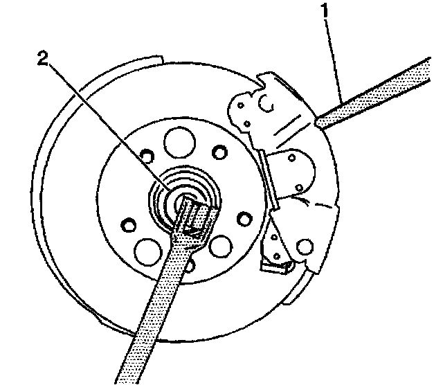 4. Insert a drift or punch (1) through the brake caliper and into the brake rotor in order to prevent the wheel hub and bearing from turning.