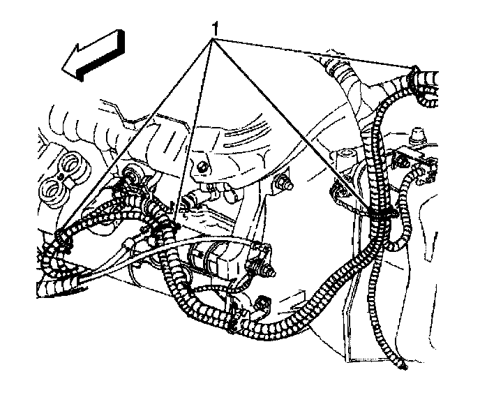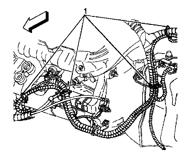 3. Use 3 new tie straps (1) in order to secure the coolant heater cord to the engine lower wiring harness.