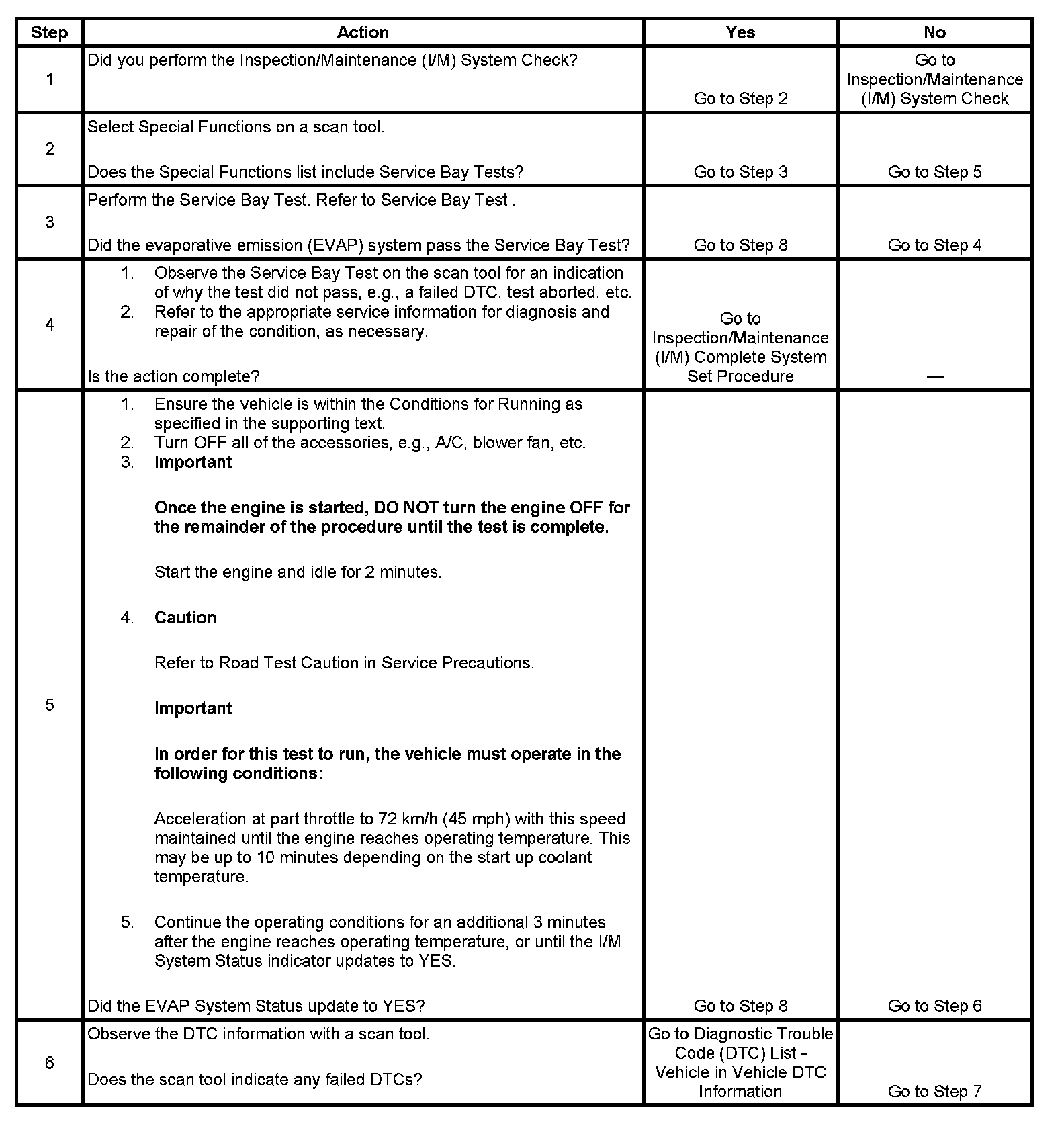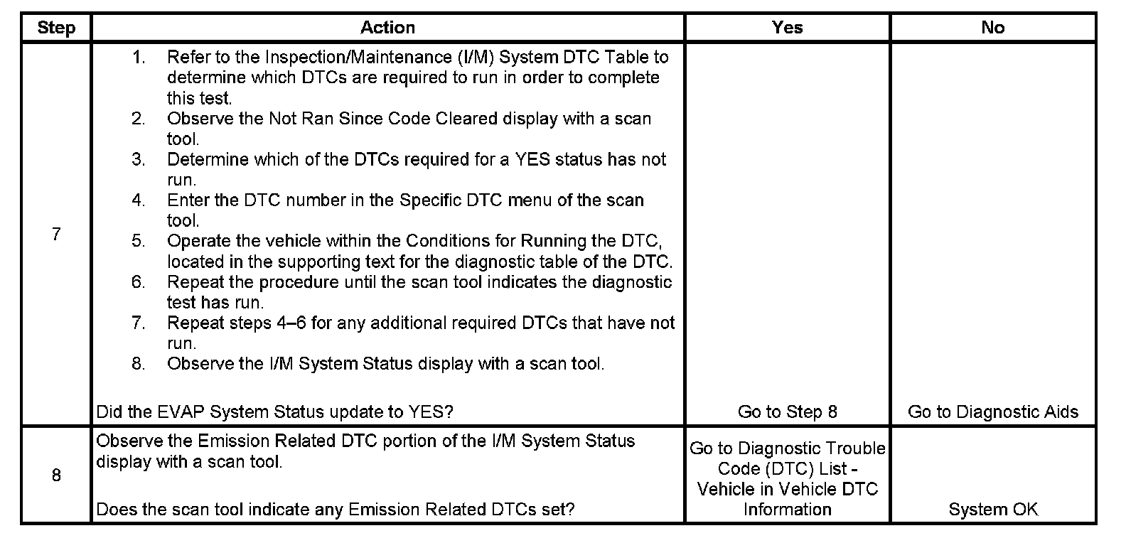 The purpose of this test is to satisfy the enable criteria necessary to execute inspection/maintenance (I/M) readiness diagnostics for the evaporative emission (EVAP) system. The test may be used to set the I/M System Status indicators to YES. The I/M System Status display on the scan tool indicates whether or not the control module has completed the required test. The required test is complete when either all of the DTCs comprising the test have run and passed, or when any one of the DTCs comprising the test has illuminated the malfunction indicator lamp (MIL). Once the test is complete, the I/M System Status display will indicate YES in the completed column. Performing a visual inspection prior to running the EVAP test may prevent having to repeat the test due to the fact that a failed or aborted test will require the vehicle to cool down in order to meet the enable criteria to run another test.