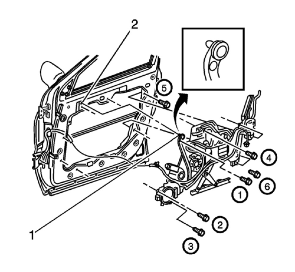 1. Remove the door trim panel. Refer to Front Side Door Trim Panel Replacement Service and Repair.