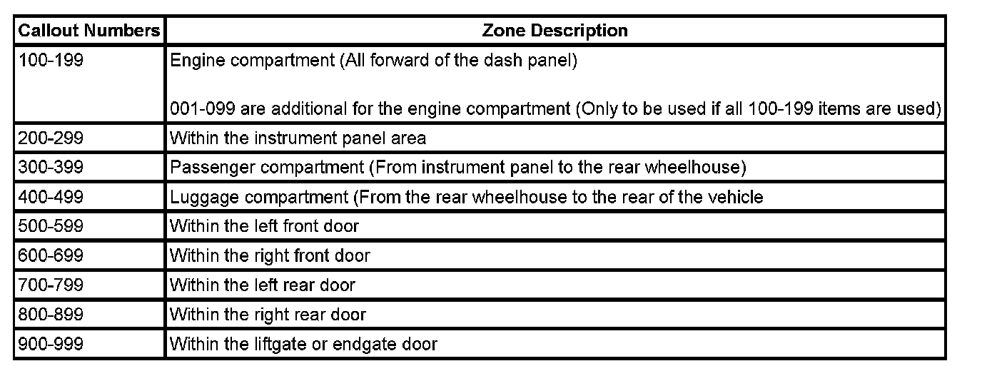 All grounds, in-line connectors, pass-through grommets, and splices have identifying numbers that correspond to where they are located in the vehicle. The table explains the numbering system.