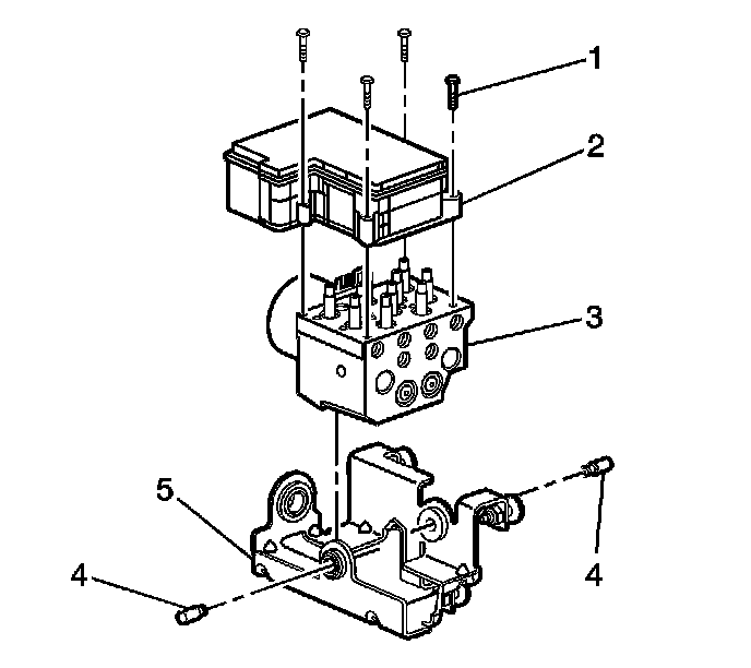 4. Remove the mounting screws (1) that fasten the EBCM (2) to the brake pressure modulator valve (BPMV) (3).