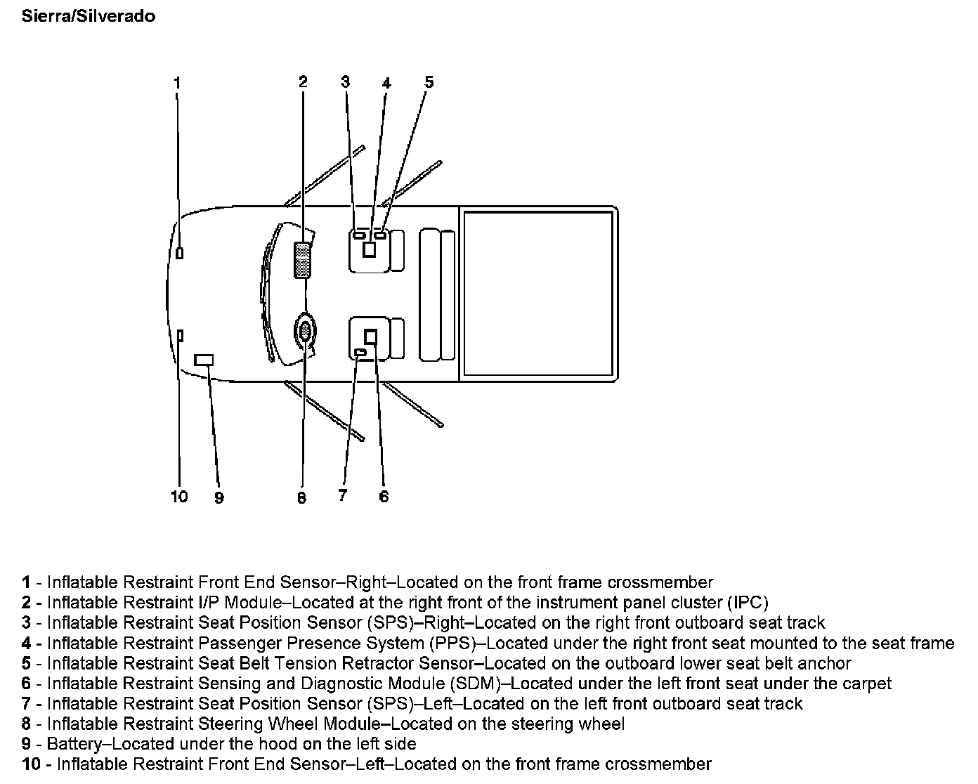 The SIR Zone Identification Views shown illustrate the approximate location of all SIR components available for the vehicle. This will assist in determining the appropriate SIR Disabling and Enabling Zones for a given service procedure, refer to SIR Disabling and Enabling Zones.