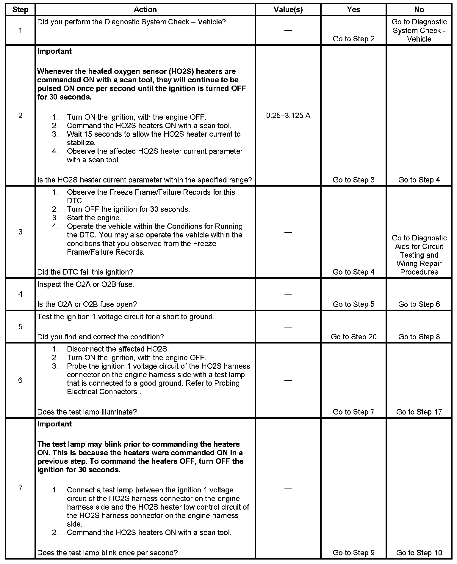 The heated oxygen sensor (HO2S) must reach operating temperature to provide an accurate voltage signal. A heating element inside the HO2S minimizes the time required for the sensor to reach operating temperature. Voltage is provided to the heater by the ignition 1 voltage circuit through a fuse. With the engine running, ground is provided to the heater by the HO2S heater low control circuit, through a low side driver within the powertrain control module (PCM). The PCM commands the heater ON or OFF to maintain a specific HO2S operating temperature range. The PCM determines the temperature by measuring the current flow through the heater. When the heater is in the ON state, the PCM will pulse the heater OFF for a duration of 50 ms, once per second. The PCM calculates the heater resistance on a cold start. This diagnostic will only run once per ignition cycle. If the PCM detects that the heater calculated resistance is not within the expected range, the following DTCs will set:
