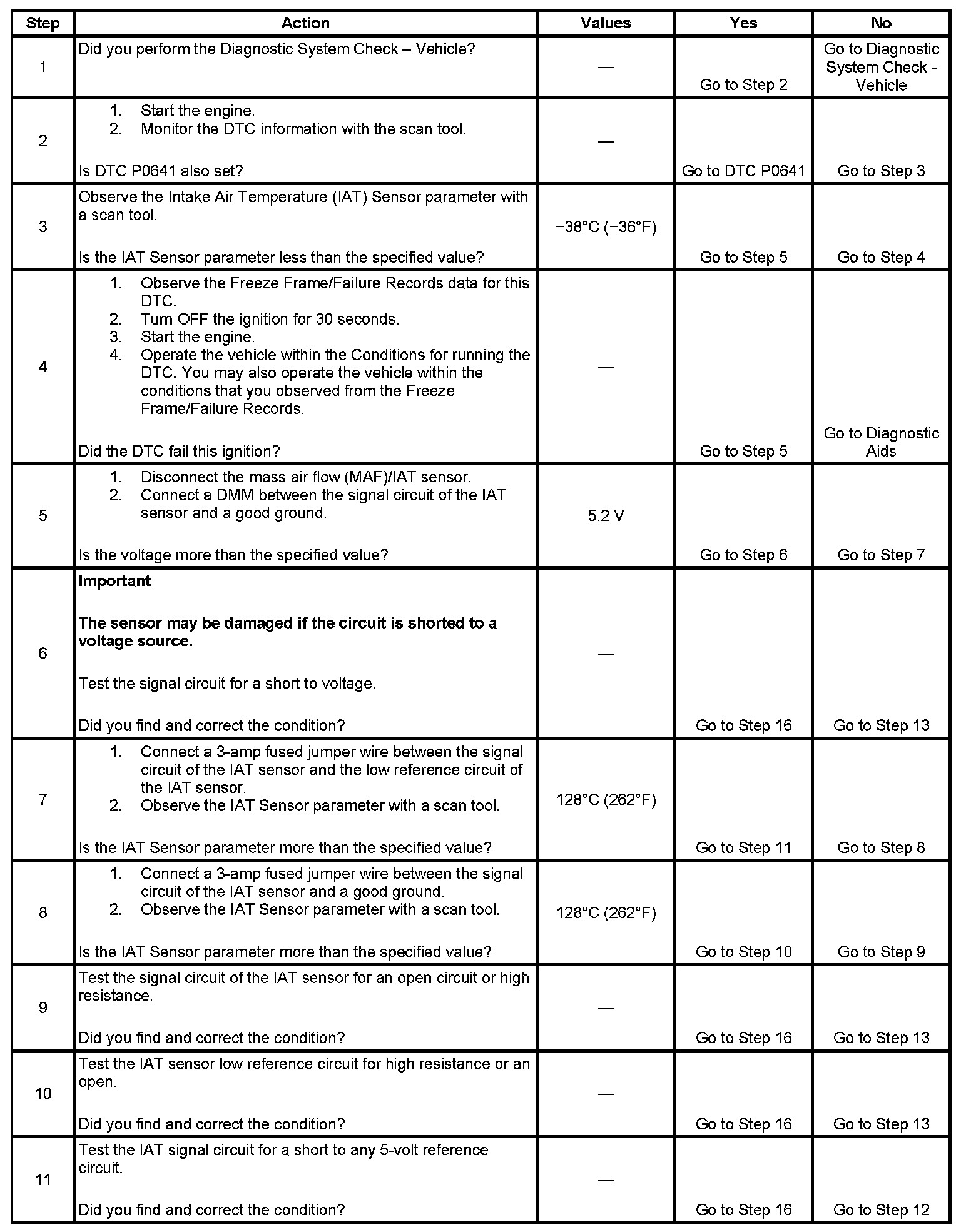 The intake air temperature (IAT) sensor is a variable resistor. The IAT sensor has a signal circuit and a low reference circuit. The IAT sensor measures the temperature of the air entering the engine. The powertrain control module (PCM) supplies 5 volts to the IAT signal circuit and a ground for the IAT low reference circuit. When the IAT sensor is cold, the sensor resistance is high. When the air temperature increases, the sensor resistance decreases. With high sensor resistance, the PCM detects a high voltage on the IAT signal circuit. With lower sensor resistance, the PCM detects a lower voltage on the IAT signal circuit. If the PCM detects an excessively high IAT signal voltage, indicating a low temperature, DTC P0113 sets.