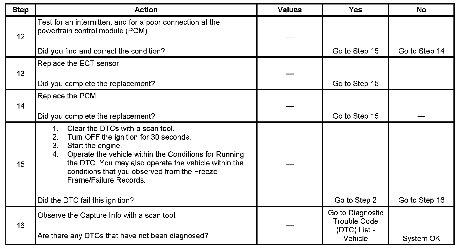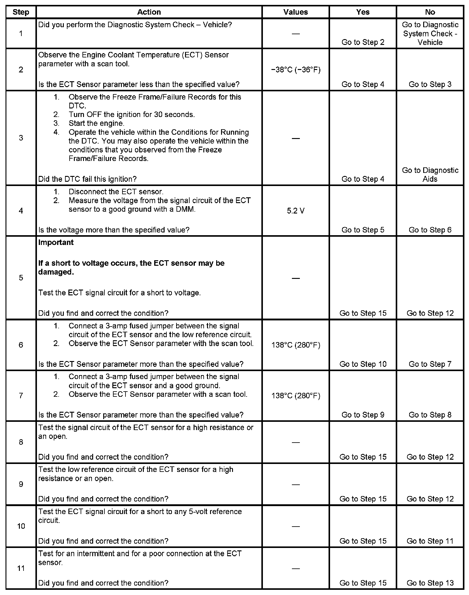 The engine coolant temperature (ECT) sensor is a variable resistor, that measures the temperature of the engine coolant. The ECT sensor has a signal circuit and a low reference circuit. The powertrain control module (PCM) supplies 5 volts to the ECT signal circuit and a ground for the ECT low reference circuit. When the ECT is cold, the sensor resistance is high. When the ECT increases, the sensor resistance decreases. With high sensor resistance, the PCM detects a high voltage on the ECT signal circuit. With lower sensor resistance, the PCM detects a lower voltage on the ECT signal circuit. If the PCM detects an excessively high ECT signal voltage, which is a low temperature indication, DTC P0118 sets.