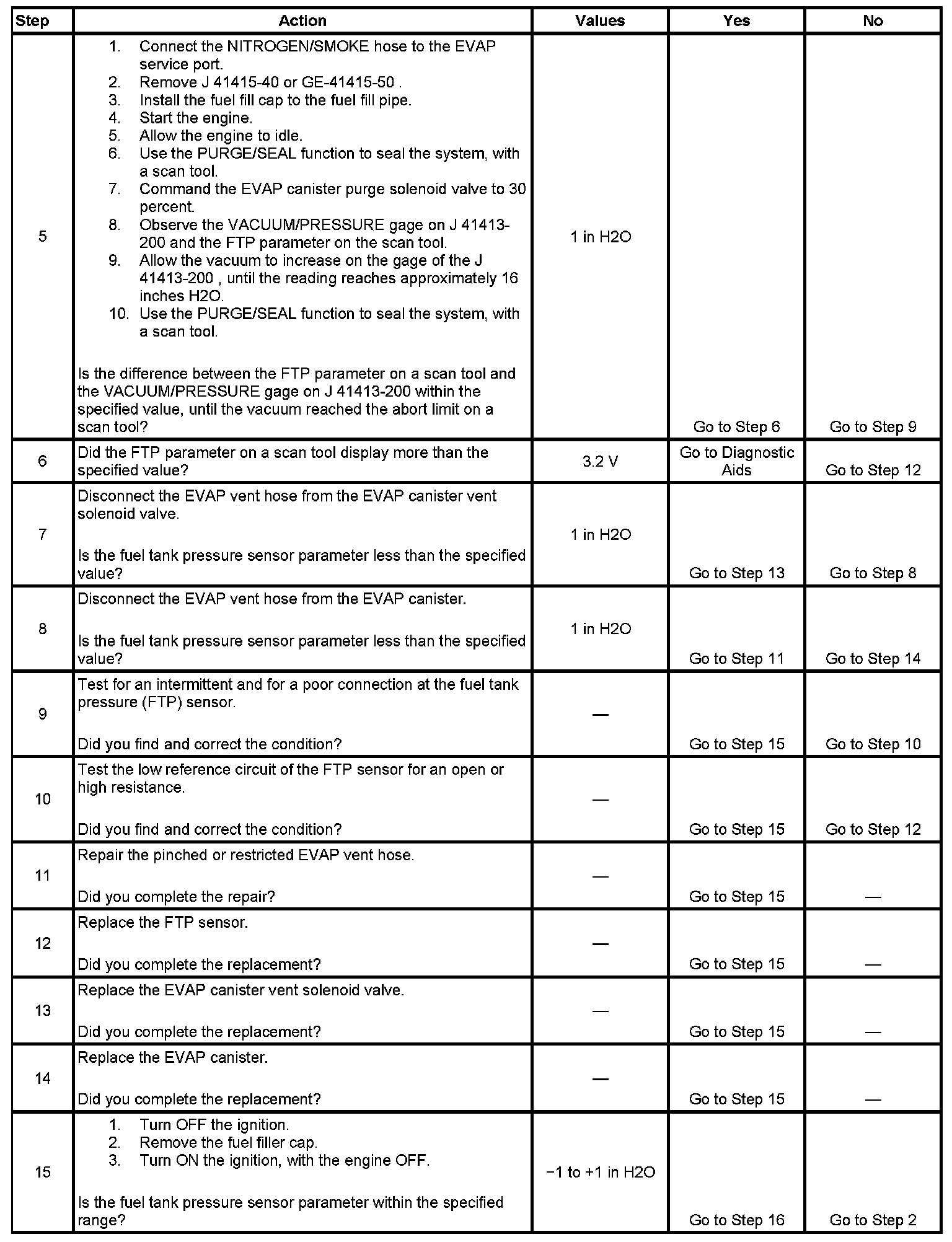 This DTC tests the Evaporative Emission (EVAP) System for a restricted or blocked EVAP vent path. The control module commands the EVAP canister purge solenoid valve Open and the EVAP canister vent solenoid valve Closed. This allows vacuum to be applied to the EVAP system. Once a calibrated vacuum level has been reached, the control module commands the EVAP canister purge solenoid valve Closed and the EVAP canister vent solenoid valve Open. The control module monitors the fuel tank pressure (FTP) sensor for a decrease in vacuum. If the vacuum does not decrease to near 0 inches H2O in a calibrated time, this DTC sets.