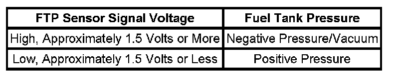 The table illustrates the relationship between the FTP sensor signal voltage and the EVAP system pressure/vacuum.