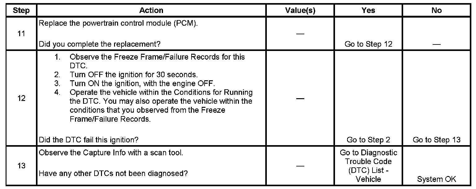 - The control module records the operating conditions at the time the diagnostic fails. The first time the diagnostic fails, the control module stores this information in the Failure Records. If the diagnostic reports a failure on the second consecutive ignition cycle, the control module records the operating conditions at the time of the failure. The control module writes the operating conditions to the Freeze Frame and updates the Failure Records.