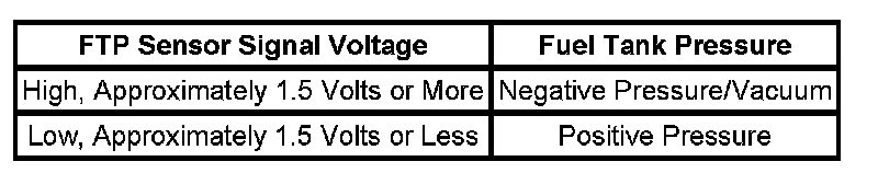 The table illustrates the relationship between FTP sensor signal voltage and the EVAP system pressure/vacuum.