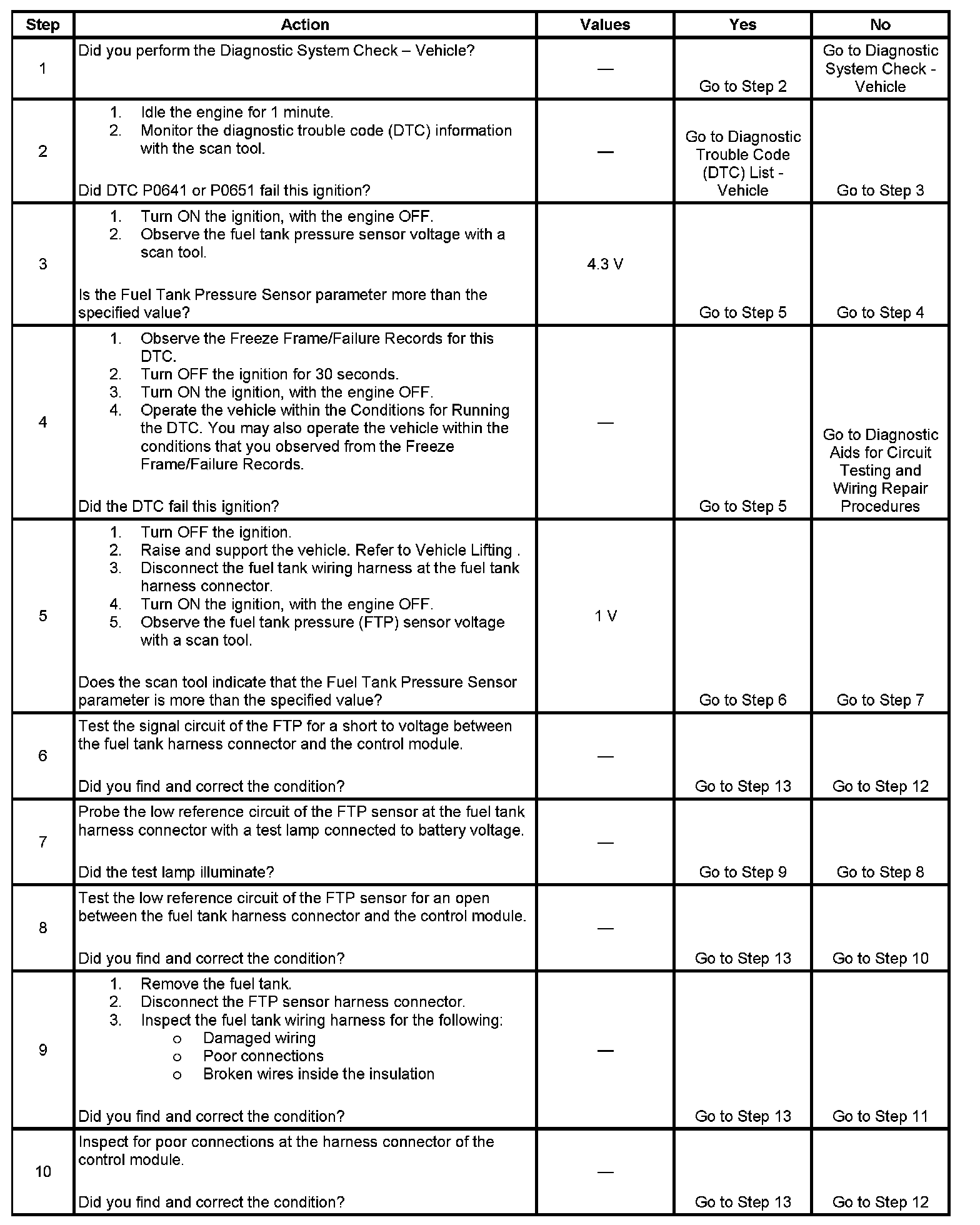 The fuel tank pressure (FTP) sensor measures the difference between the air pressure or vacuum in the evaporative emission (EVAP) system, and the outside air pressure. The control module supplies a 5-volt reference and a low reference circuit to the FTP sensor. The FTP sensor signal circuit voltage varies depending on EVAP system pressure or vacuum. If the FTP sensor signal voltage increases above a calibrated value, this DTC sets.