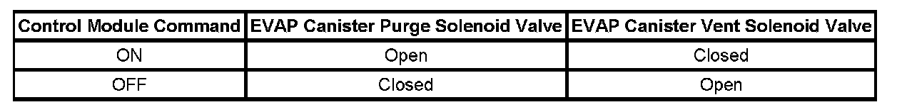 The table illustrates the relationship between the ON and OFF states, and the OPEN or CLOSED states of the EVAP canister purge and vent solenoid valves.