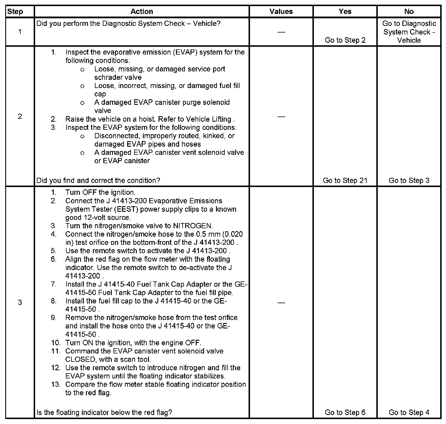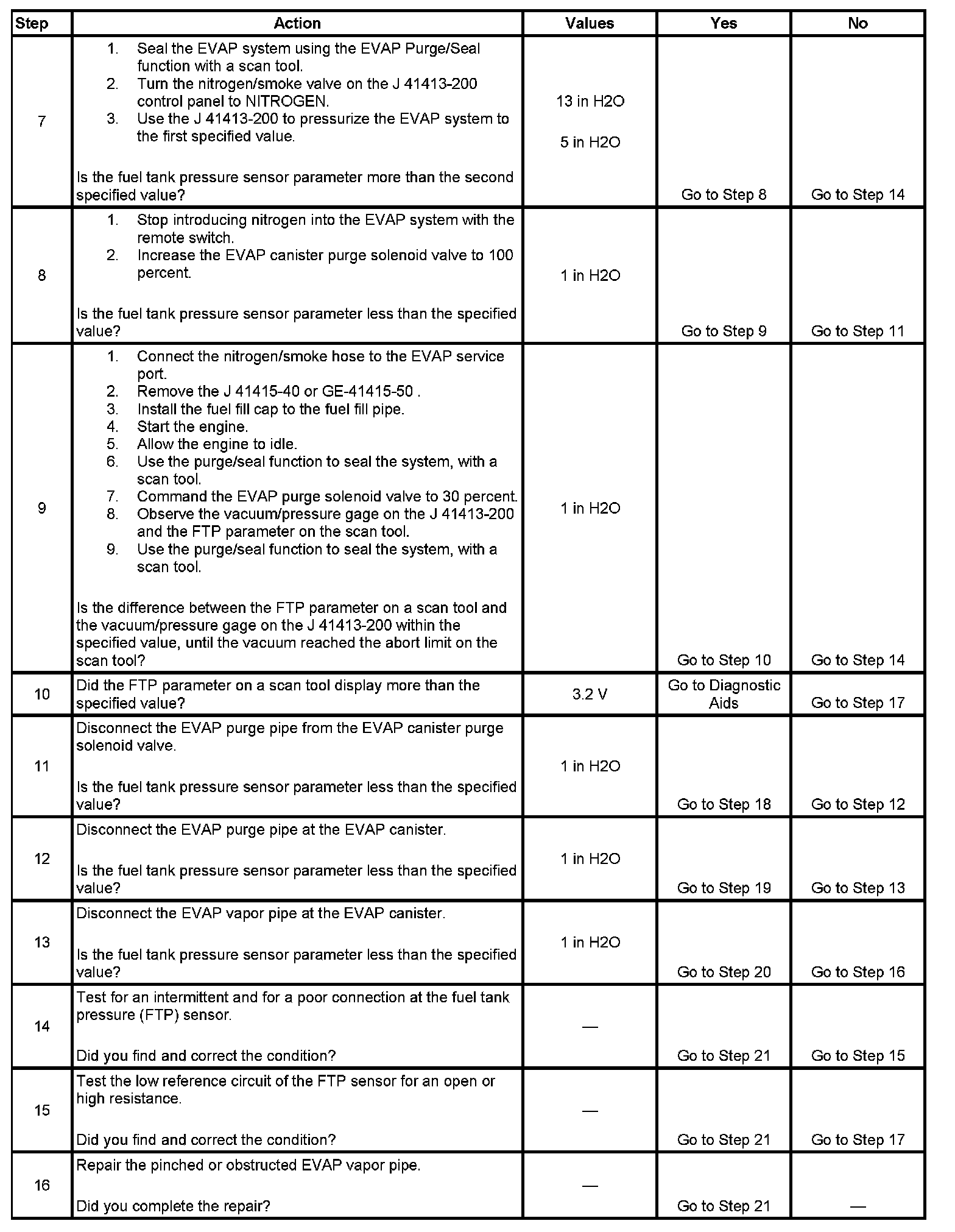 The control module tests the evaporative emission (EVAP) system for a large leak. The control module monitors the fuel tank pressure (FTP) sensor signal to determine the EVAP system vacuum level. When the conditions for running are met, the control module commands the EVAP canister purge solenoid valve open and the EVAP canister vent solenoid valve closed. This allows engine vacuum to enter the EVAP system. At a calibrated time, or vacuum level, the control module commands the EVAP canister purge solenoid valve closed, sealing the system, and monitors the FTP sensor input in order to determine the EVAP system vacuum level. If the system is unable to achieve the calibrated vacuum level, or the vacuum level decreases too rapidly, this DTC sets.
