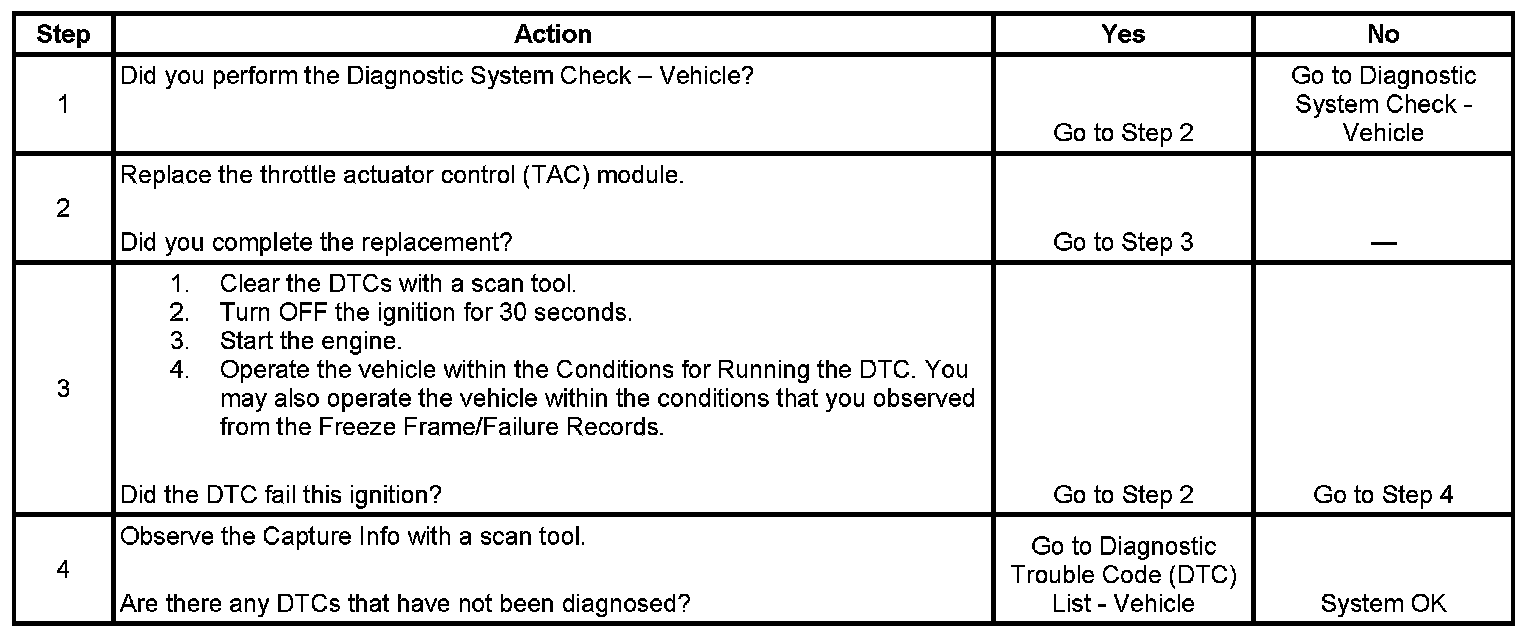The throttle actuator control (TAC) module contains data which is essential for proper TAC System operation. The TAC module continuously tests the integrity of this data. When the TAC module is unable to write or read data to and from random access memory (RAM), or the TAC module is unable to correctly read data from the flash memory or an internal TAC module processor fault is detected, this DTC sets.