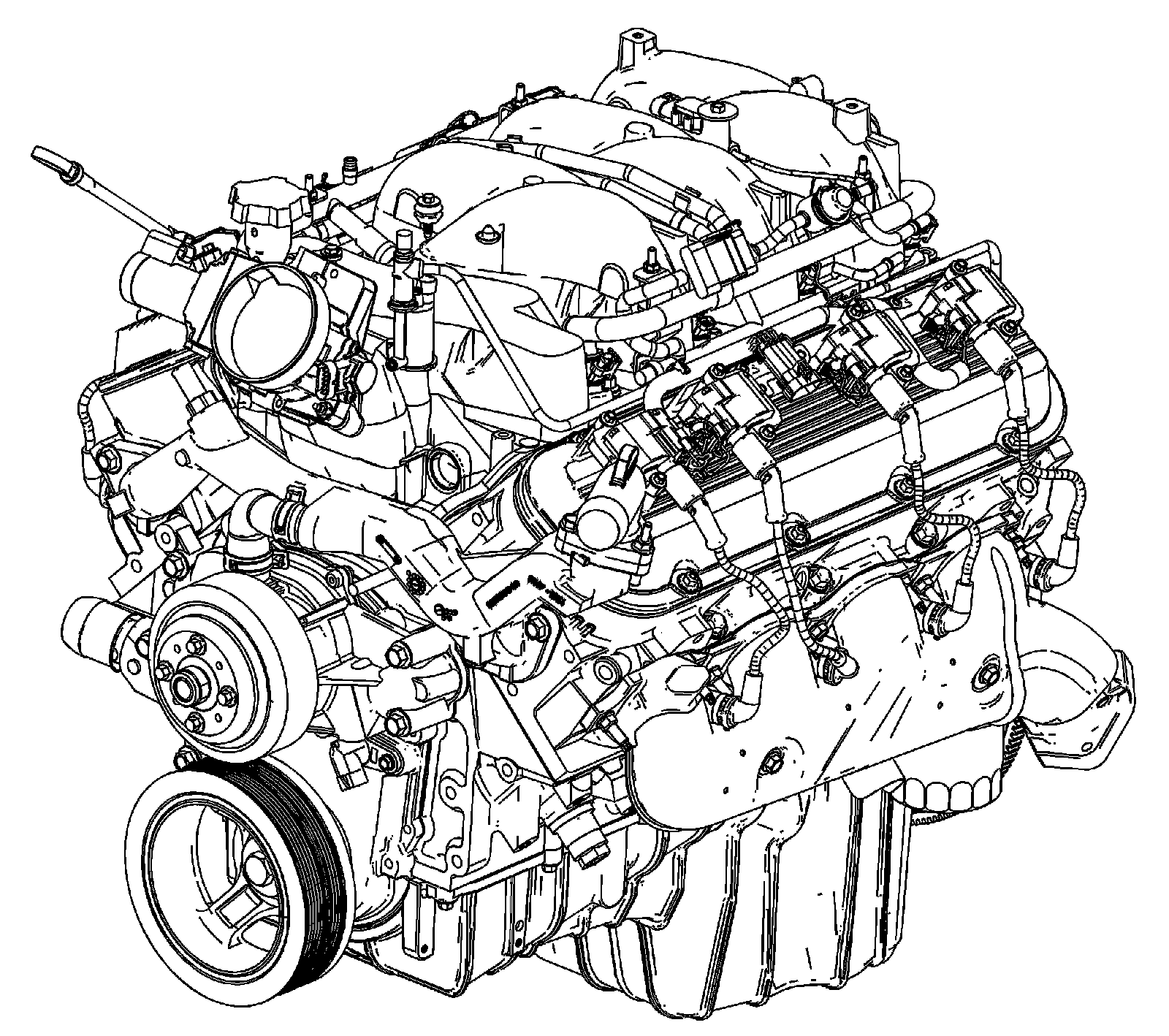 The intake manifold is a 1-piece cast aluminum design. The throttle body is attached to the front of the intake manifold. The fuel rail assembly with 8 separate fuel injectors is retained to the intake manifold by 4 studs. The fuel injectors are seated in their individual manifold bores with O-ring seals to provide sealing. A Manifold Absolute Pressure (MAP) sensor is mounted on the top of the intake manifold and sealed by an O-ring seal. The MAP sensor is held in place with a retainer bolt. The evaporative emission (EVAP) canister purge solenoid valve is located in the front of the intake manifold. The positive crankcase ventilation (PCV) system is internally cast into the intake manifold. There is no serviceable PCV valve. A splash shield is installed under the intake manifold. The shield prevents hot oil from contacting the bottom of the intake manifold.