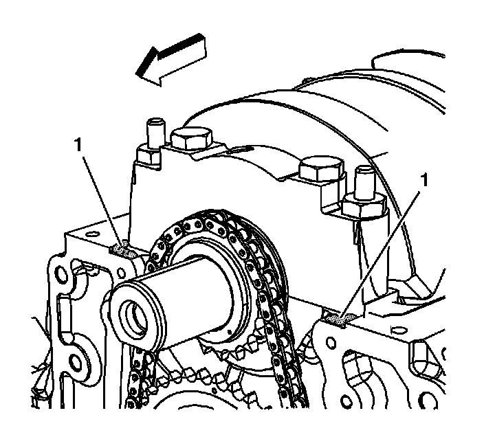 Apply a 3 - 4 mm (0.12 - 0.16 inch) bead of sealant GM P/N 12346286, (Canadian P/N 10953472), or equivalent in 2 sealant points (1) on the engine block where the front cover meets the oil pan.