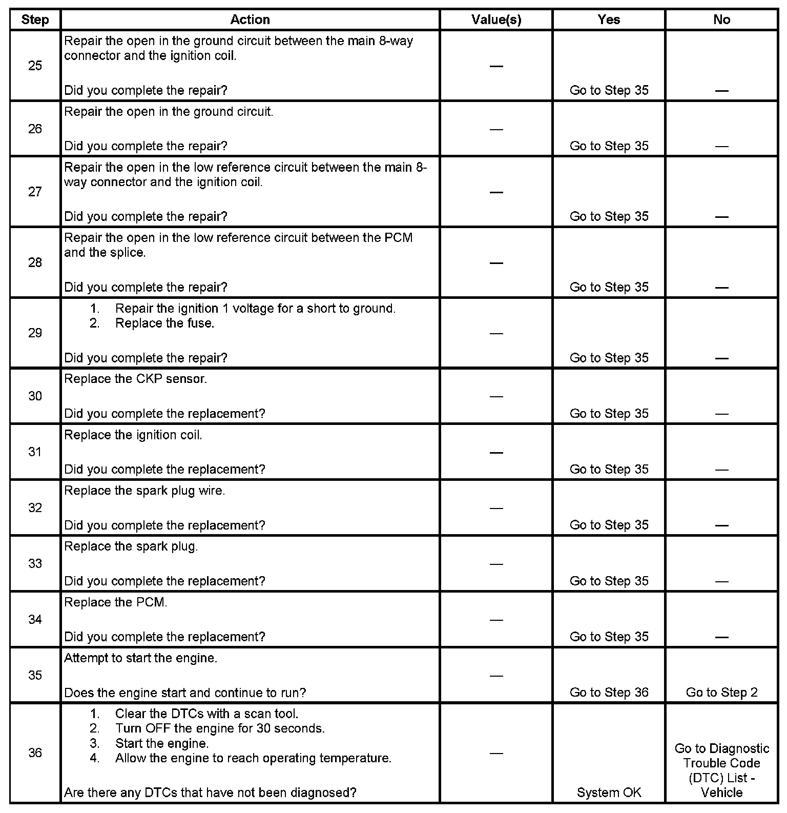 The numbers below refer to the step numbers on the diagnostic table.