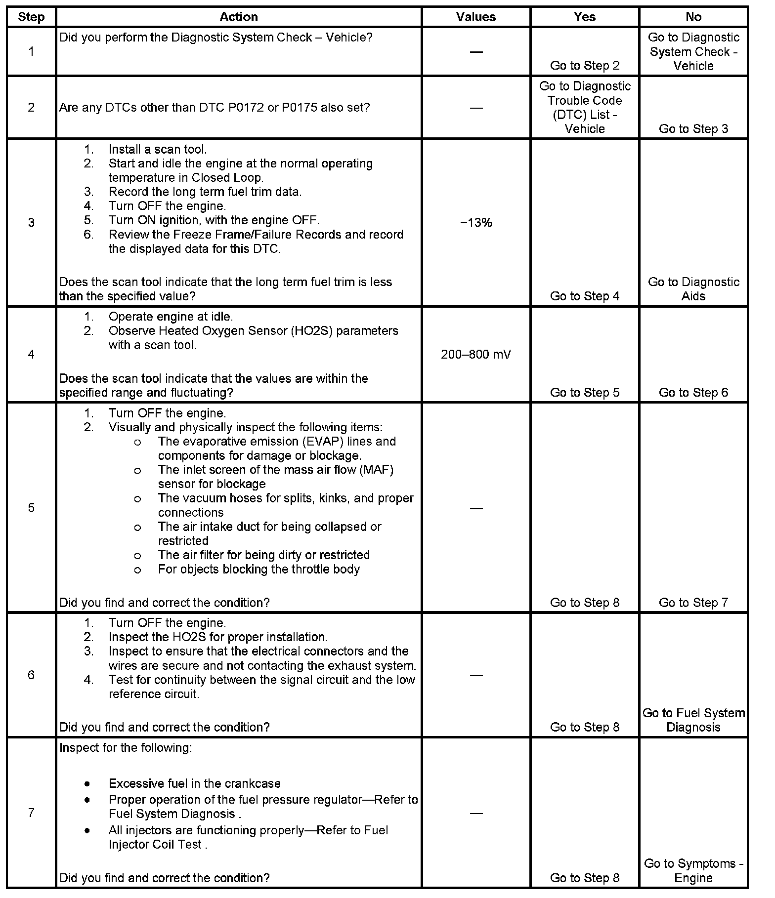 The powertrain control module (PCM) controls the air/fuel metering system in order to provide the best possible combination of driveability, fuel economy, and emission control. Fuel delivery is controlled differently during Open and Closed Loop. During Open Loop, the PCM determines fuel delivery based on sensor signals without oxygen sensor input. During Closed Loop, the PCM adds oxygen sensor inputs and level of purge to calculate short and long term fuel trim adjustments. If the oxygen sensors indicated a lean condition, fuel trim values will be above 0 percent. If the oxygen sensors indicate a rich condition, fuel trim values will be below 0 percent. The values for the short term fuel trim change rapidly in response to the heated oxygen sensor (HO2S) voltage signals. Long term fuel trim makes coarse adjustments in order to maintain an air/fuel ratio of 14.7:1. A block of cells contain information arranged in combinations of engine RPM and engine load for a fuel range of vehicle operating conditions. The long term fuel trim diagnostic is based on an average of cells currently being used. The PCM selects the cells based on the engine speed and engine load. The fuel trim diagnostic will conduct a test to determine if a rich failure actually exists, or if excessive vapor from the evaporative emission (EVAP) canister is causing a rich condition. If the PCM detects an excessively rich condition, DTC P0172 or P0175 sets.