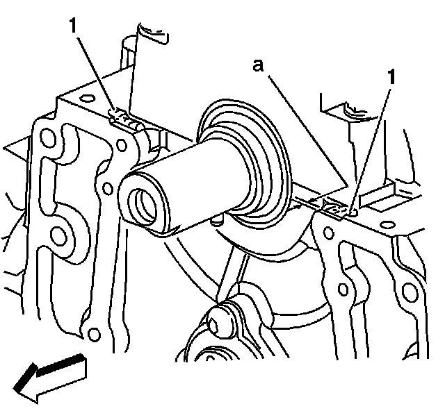 3. Apply sealant GM P/N 12346286 (Canadian P/N 10953472) or equivalent in 2 places (1) on the engine block where the front cover meets the oil pan.