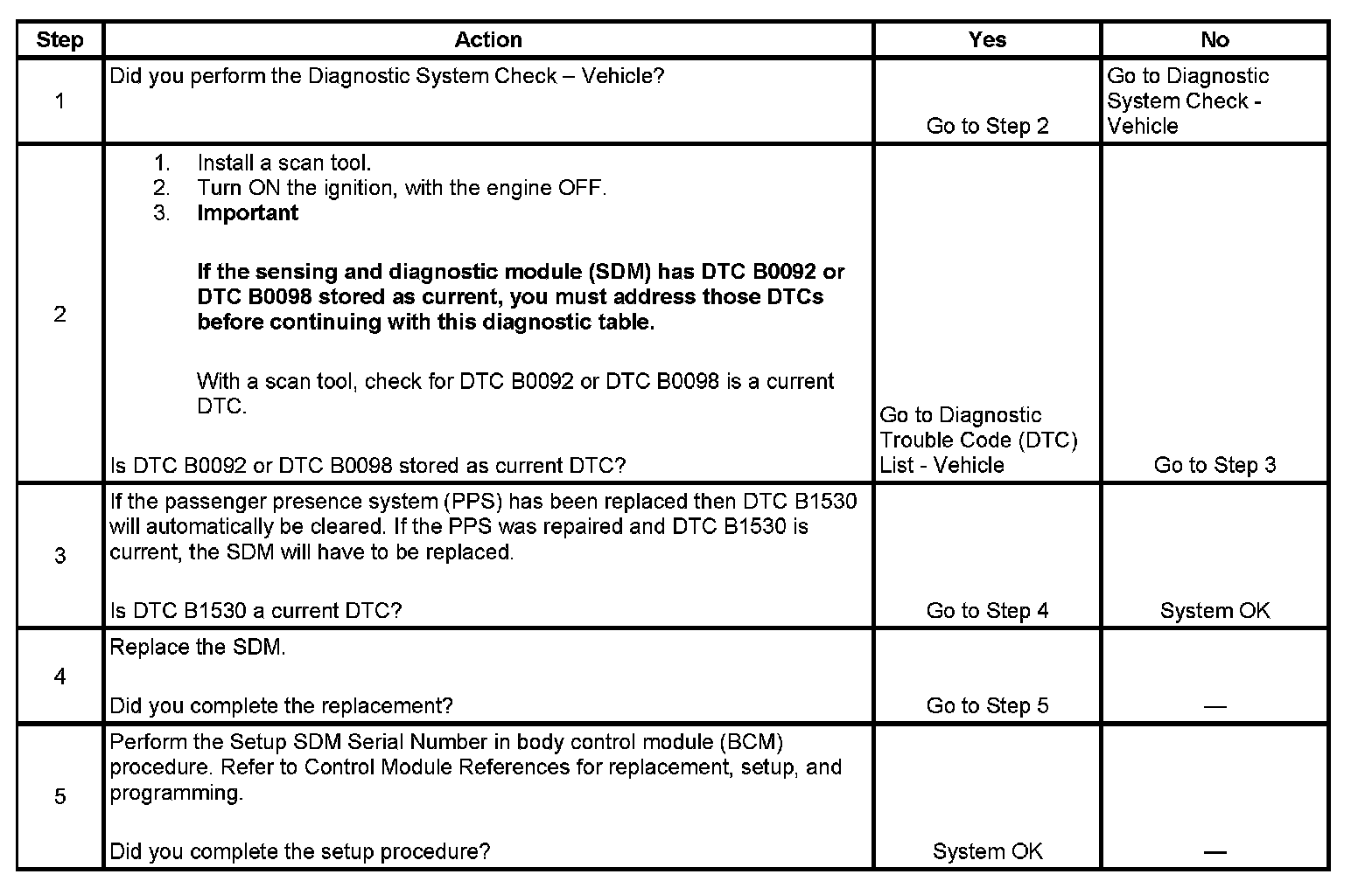 IMPORTANT: DTC B0092 or DTC B0098 will set if the PPS has a malfunction, and has set any one of the following DTCs: 023, 024, 063, 064, or 065. When DTC B0092 or DTC B0098 is present, it is important to check the PPS for any current DTC. Refer to Passenger Presence System Flash Code Procedures. If the PPS has any current DTCs, address those DTCs before performing this DTC chart. Reading and Clearing Diagnostic Trouble Codes