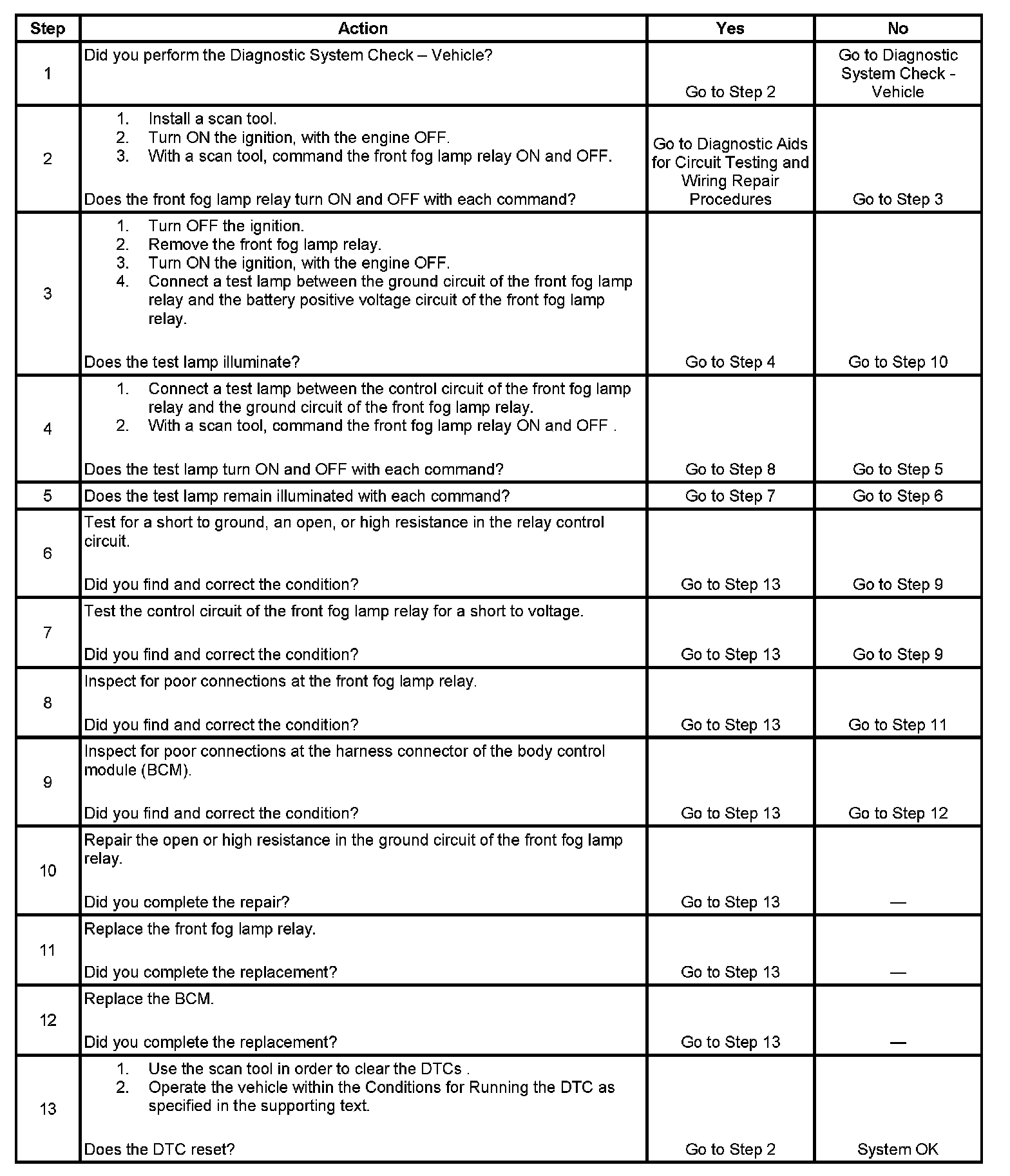 When the body control module (BCM) senses that the front fog lamp switch signal circuit is grounded momentarily by pressing the front fog lamp switch, the BCM energizes the front fog lamp relay by grounding the front fog lamp relay control circuit. The front fog lamp indicator is also illuminated utilizing the same fog lamp relay control circuit.