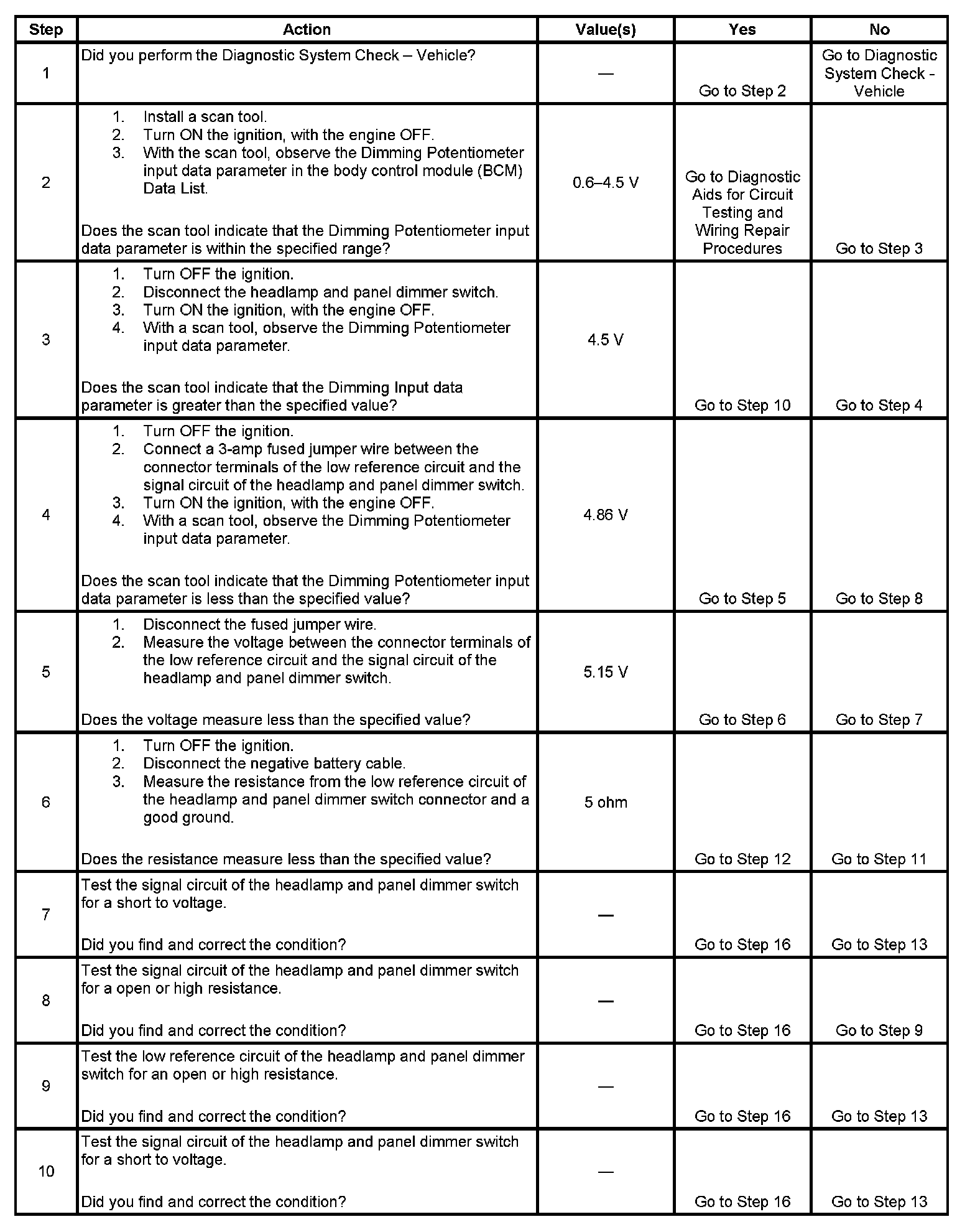 The body control module (BCM) directly sends a reference voltage to the instrument panel (I/P) dimmer switch which is then reduced based on the I/P dimmer switch position and monitored as a signal to the BCM. The BCM uses this signal to directly control the desired level of I/P illumination lamp intensity.