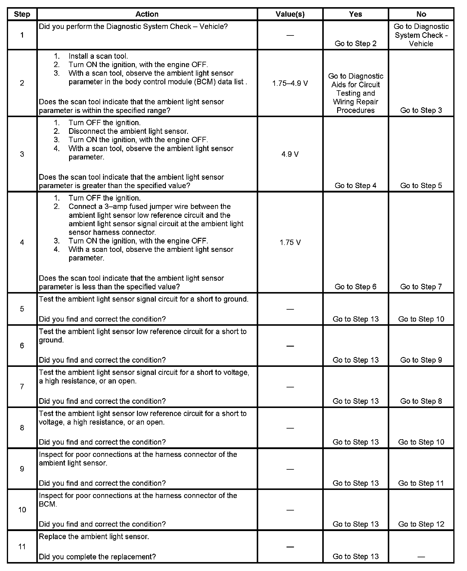 The body control module (BCM) monitors the ambient light sensor signal circuit in order to determine if the daytime running lights (DRL) or the auto headlights (ALC) should be turned ON in the AUTO mode. When the BCM senses the ambient light sensor signal voltage is between 1.75-4.9 volts, either the DRL will be commanded ON or the ALC will be commanded ON depending upon the amount of light received by the sensor.