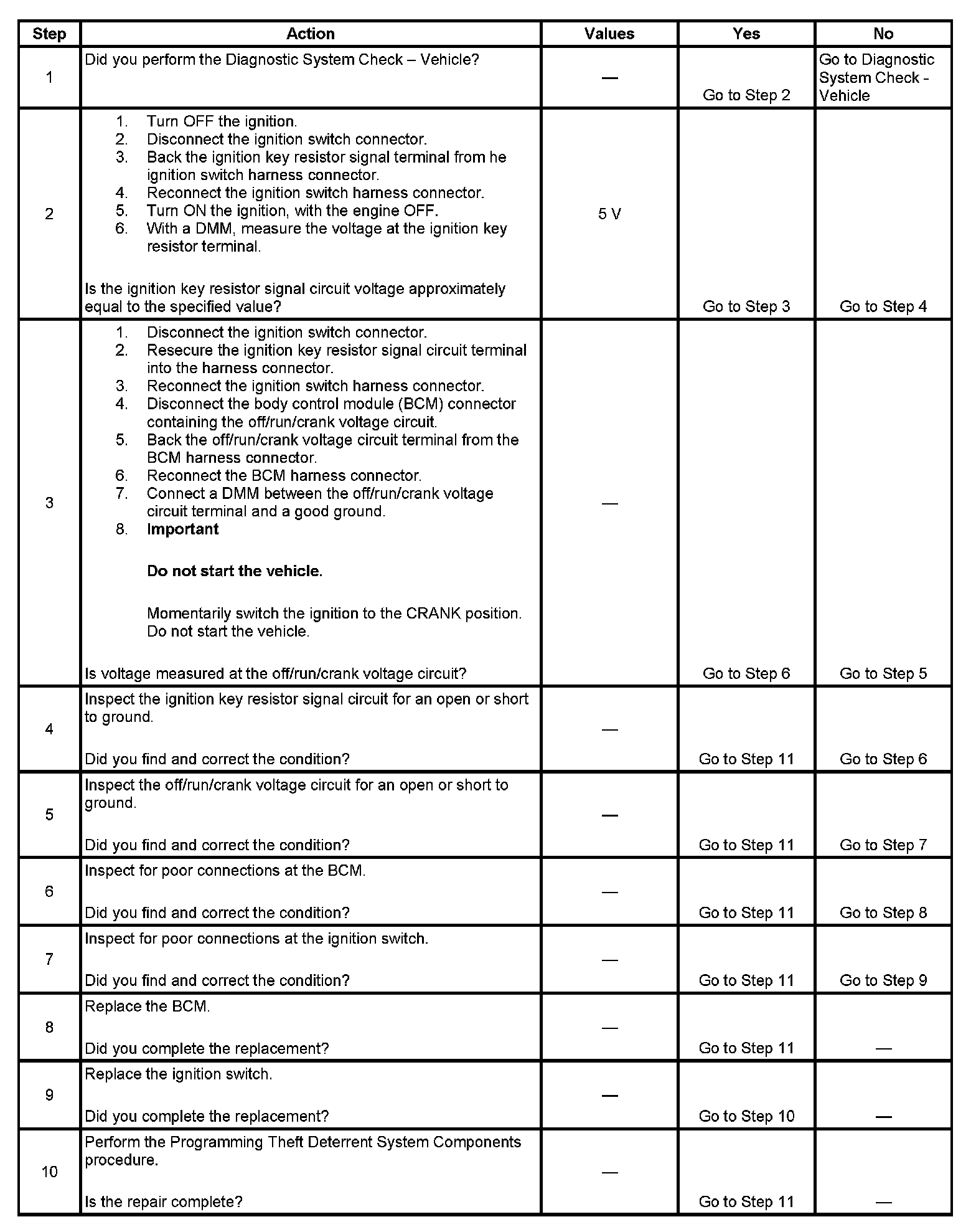 The numbers below refer to the step numbers on the diagnostic table.