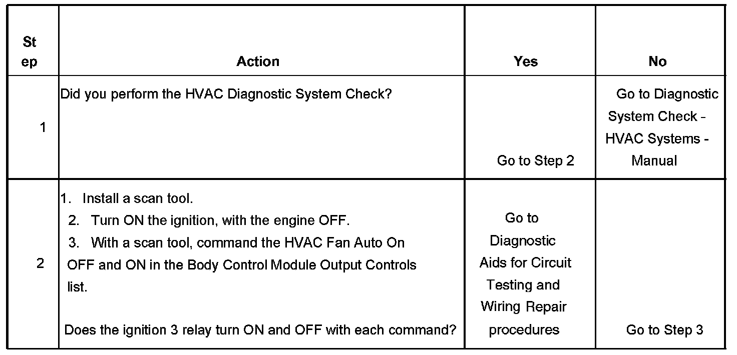 Battery voltage is supplied directly to the ignition 3 relay. The body control module (BCM) controls the relay by grounding the control circuit through an internal solid state device called a driver. The primary function of the driver is to supply the ground for the component being controlled. Each driver has a fault line which is monitored by the BCM. When the BCM is commanding a component ON, the voltage of the control circuit should be near 0 volts. When the BCM is commanding the control circuit to a component OFF, the voltage potential of the circuit should be near battery voltage.