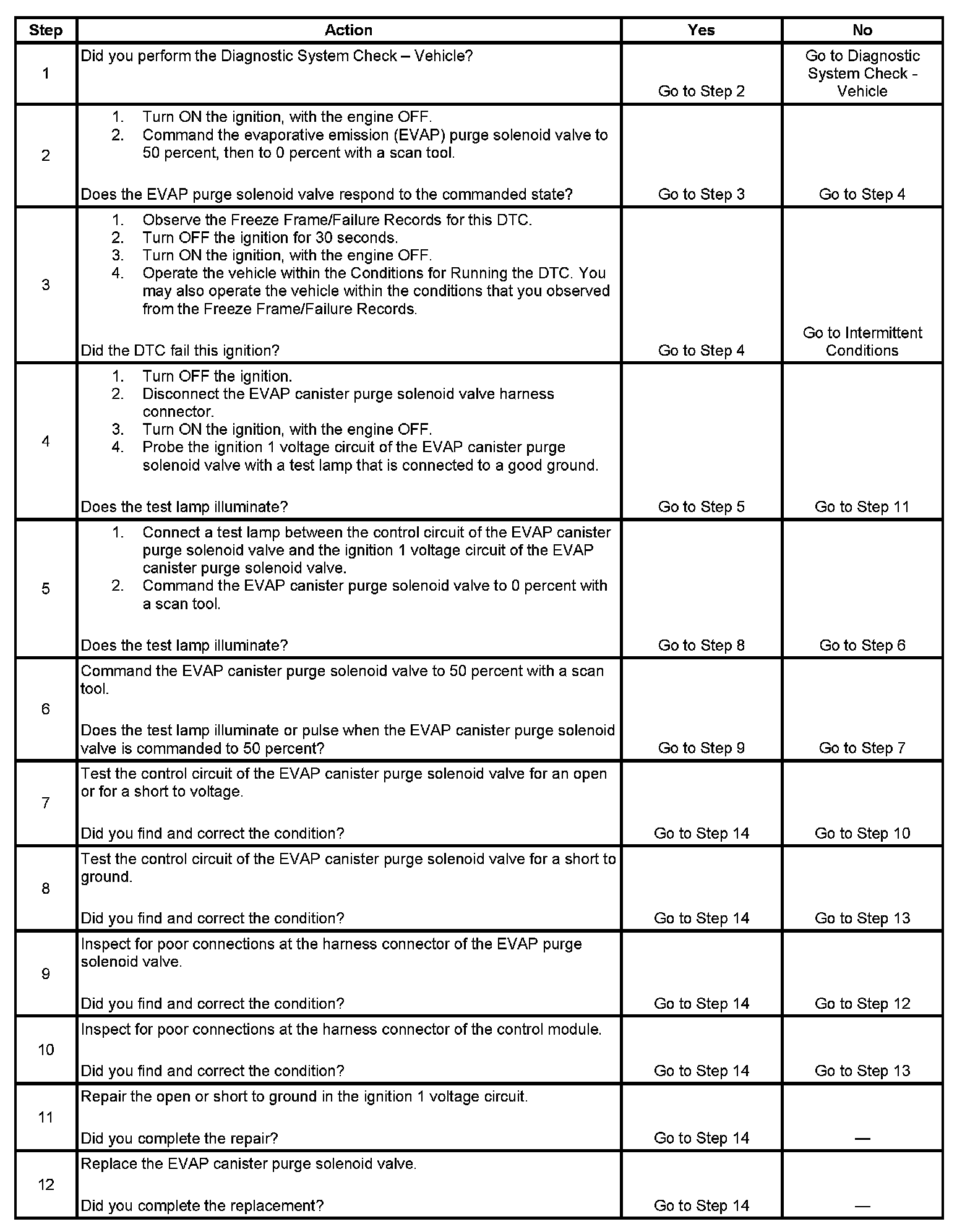 An ignition voltage is supplied directly to the evaporative emission (EVAP) canister purge solenoid valve. The EVAP canister purge solenoid valve is pulse width modulated (PWM). The scan tool displays the amount of ON time as a percentage. The control module monitors the status of the driver. The control module controls the EVAP canister purge solenoid valve ON time by grounding the control circuit via an internal switch called a driver. If the control module detects an incorrect voltage for the commanded state of the driver, this DTC sets.