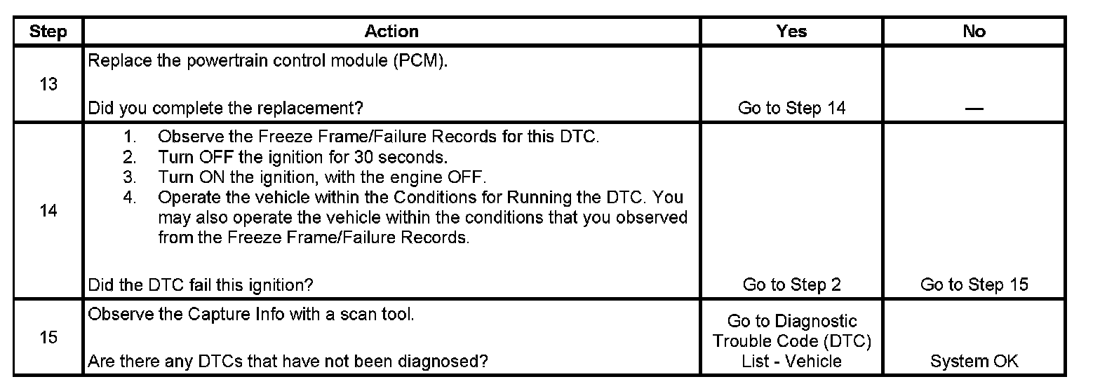- The control module records the operating conditions at the time the diagnostic fails. The first time the diagnostic fails, the control module stores this information in the Failure Records. If the diagnostic reports a failure on the second consecutive ignition cycle, the control module records the operating conditions at the time of the failure. The control module writes the operating conditions to the Freeze Frame and updates the Failure Records.