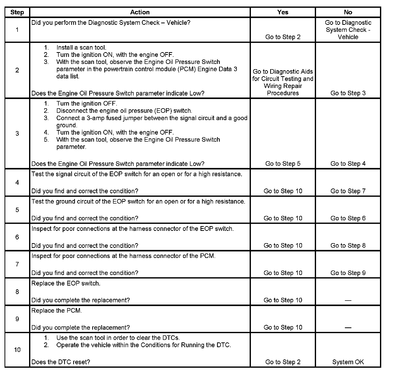 - The PCM detects that the oil pressure switch signal circuit is high.