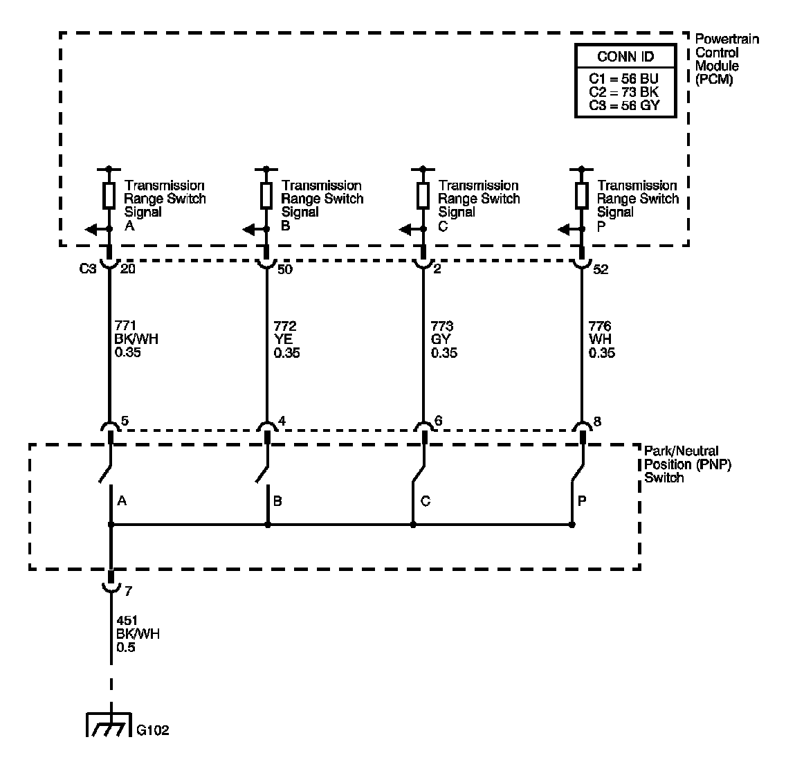 The transmission range (TR) switch is part of the park/neutral position and back-up lamp switch assembly and is externally mounted on the transmission manual shaft. The TR switch is a multi-signal switch. The powertrain control module (PCM) supplies ignition voltage to the TR switch on 4 signal circuits, A, B, C, and P. Each gear selector lever position grounds one or more of the switch circuits. In order to determine the gear range selected by the driver, the PCM compares the voltage combinations on the signal circuits to a look up table stored in the PCM memory. PCM detects the selected gear range by the state change of the switch input. Refer to Transmission Range Switch Logic table.