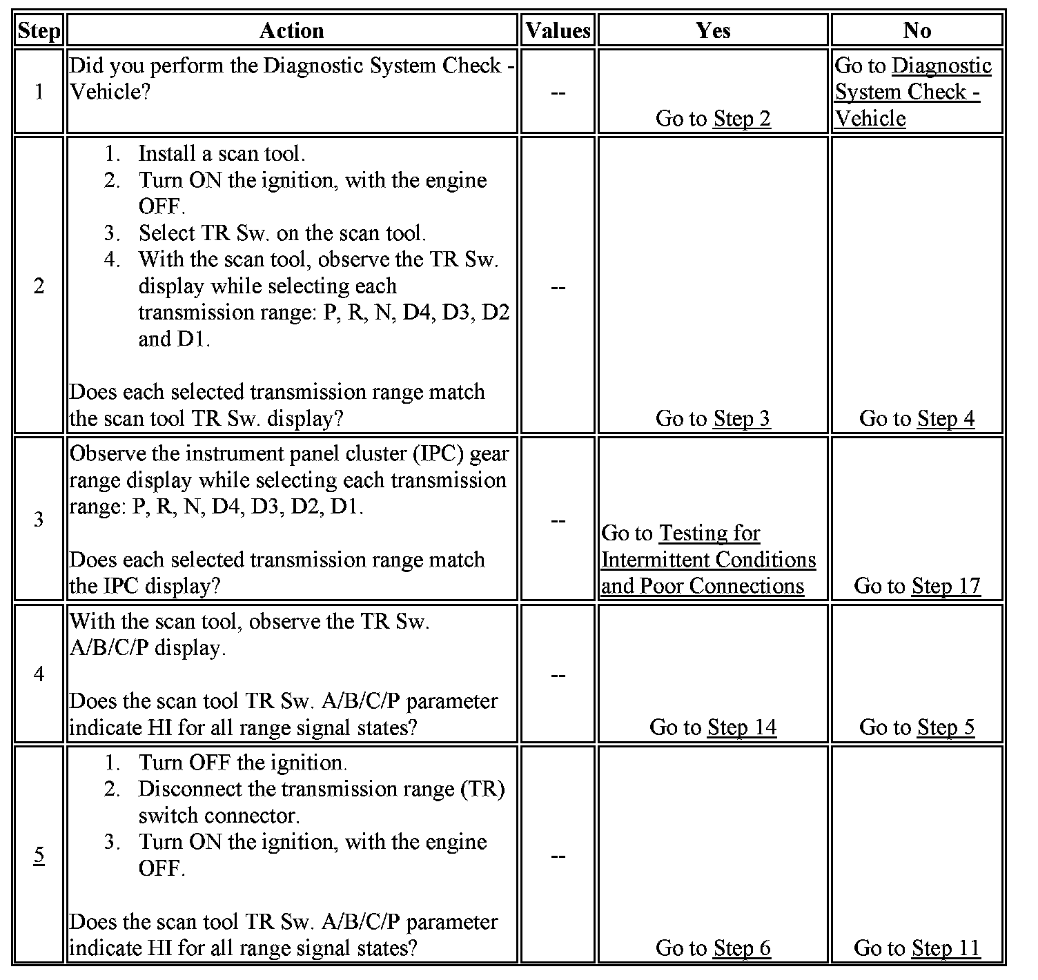 5. By disconnecting the TR switch, the ground path of all TR switch circuits would be removed and the PCM would recognize all circuits as open. The scan tool will display HI for all range signals.