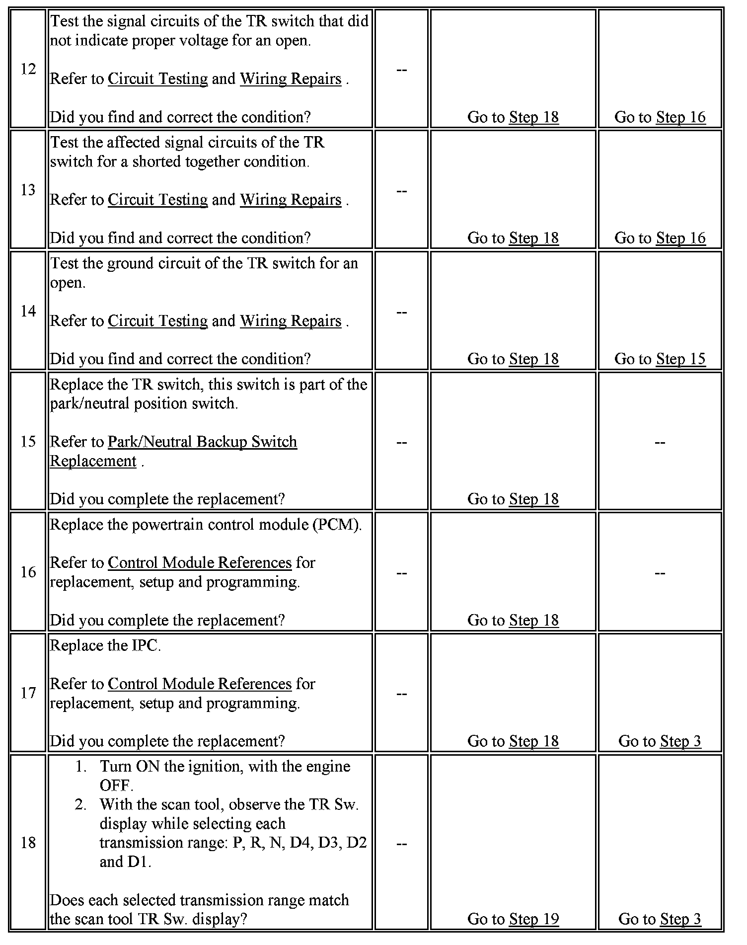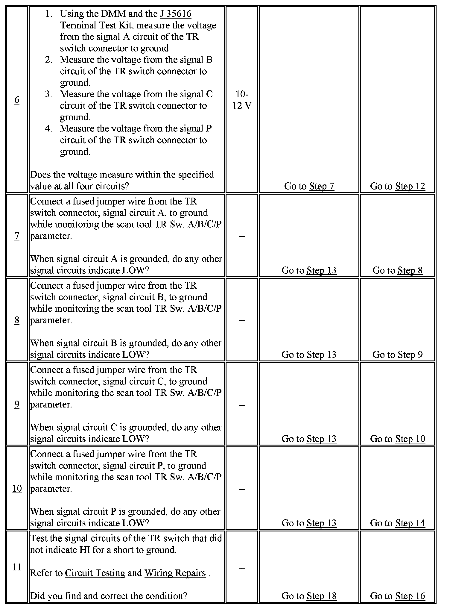 6. This step tests TR switch wiring for an open or the lack of the signal voltage from the PCM.