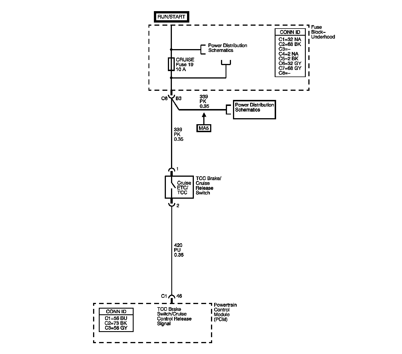 The brake switch indicates brake pedal status to the powertrain control module (PCM). The brake switch is a normally-closed switch that supplies battery voltage on the torque converter clutch (TCC) brake switch signal circuit to the PCM. Applying the brake pedal opens the switch, interrupting voltage to the PCM. When the brake pedal is released, the PCM receives a constant voltage signal. If the PCM receives a zero voltage signal at the brake switch input, and the TCC is engaged, the PCM de-energizes the TCC solenoid valve. The PCM disregards the brake switch input for TCC scheduling if there is a brake switch circuit fault.