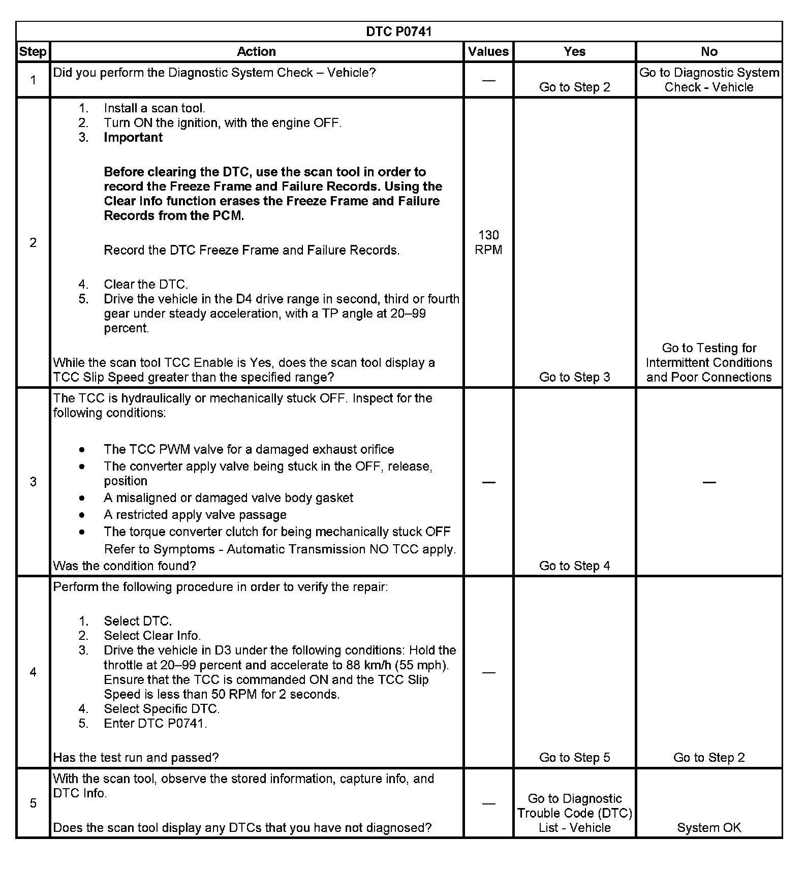 When the PCM detects a high TCC slip speed when the PCM commands the TCC ON, then DTC P0741 sets. DTC P0741 is a type B DTC.