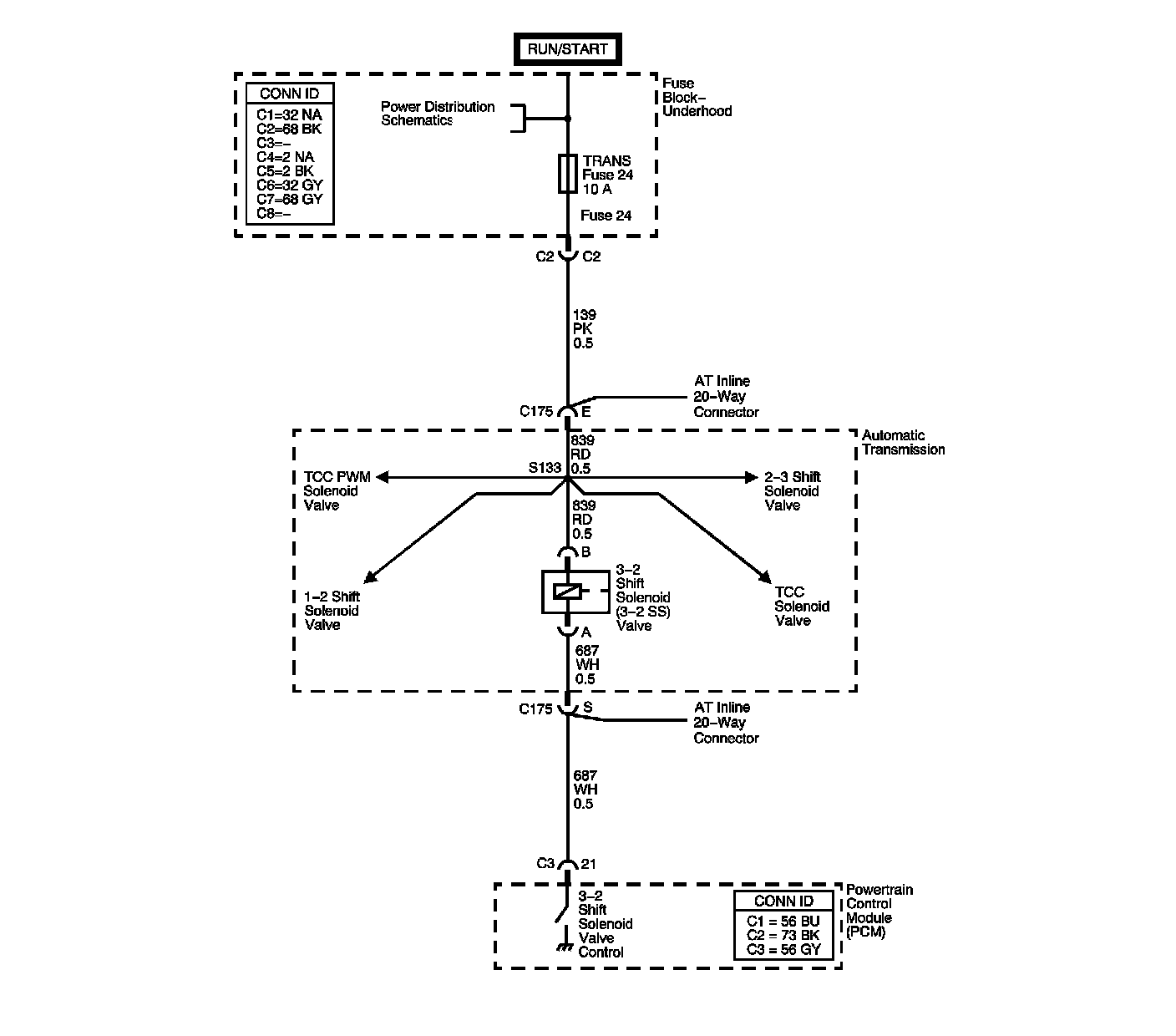 The 3-2 shift solenoid (SS) valve is a normally-closed, 3-port, on/off device that controls the 3-2 downshift. The solenoid attaches to the control valve body within the transmission. The solenoid receives ignition voltage through the ignition 1 voltage circuit. The powertrain control module (PCM) controls the solenoid by providing a ground path on the 3-2 shift solenoid valve control circuit. During a 3-2 downshift, the 2-4 band applies as the 3-4 clutch releases. The PCM varies the timing between the 3-4 clutch release and the 2-4 band apply, depending on the vehicle speed and the throttle position.