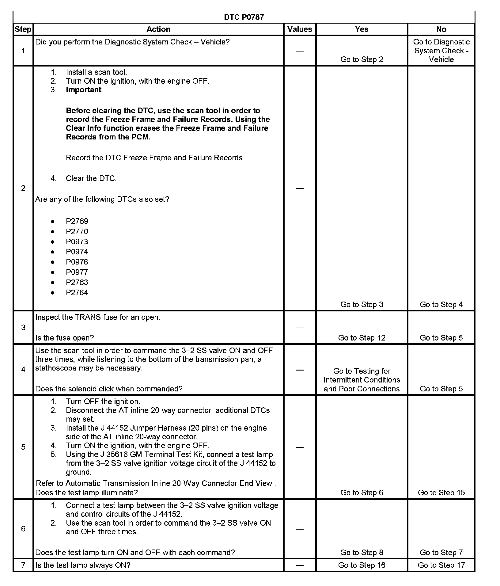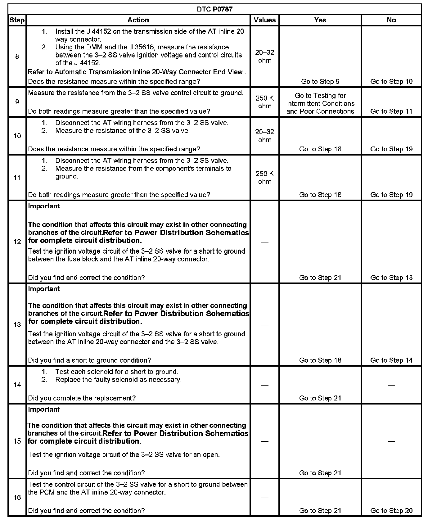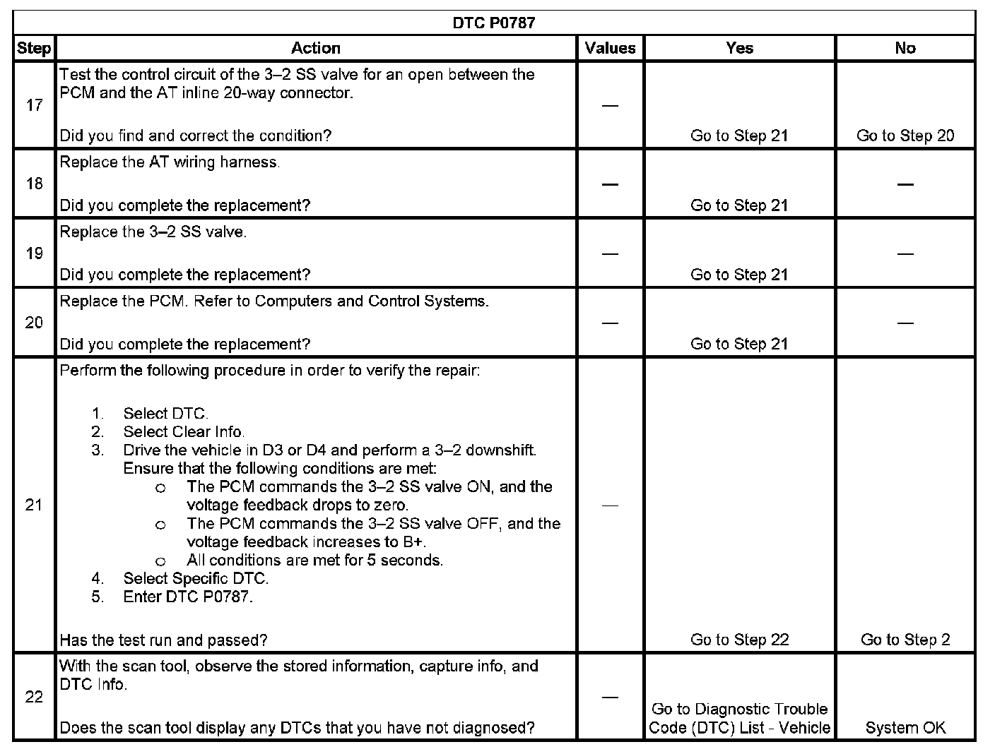 When the PCM detects a continuous open or short to ground in the 3-2 SS valve circuit, then DTC P0787 sets. DTC P0787 is a type A DTC.