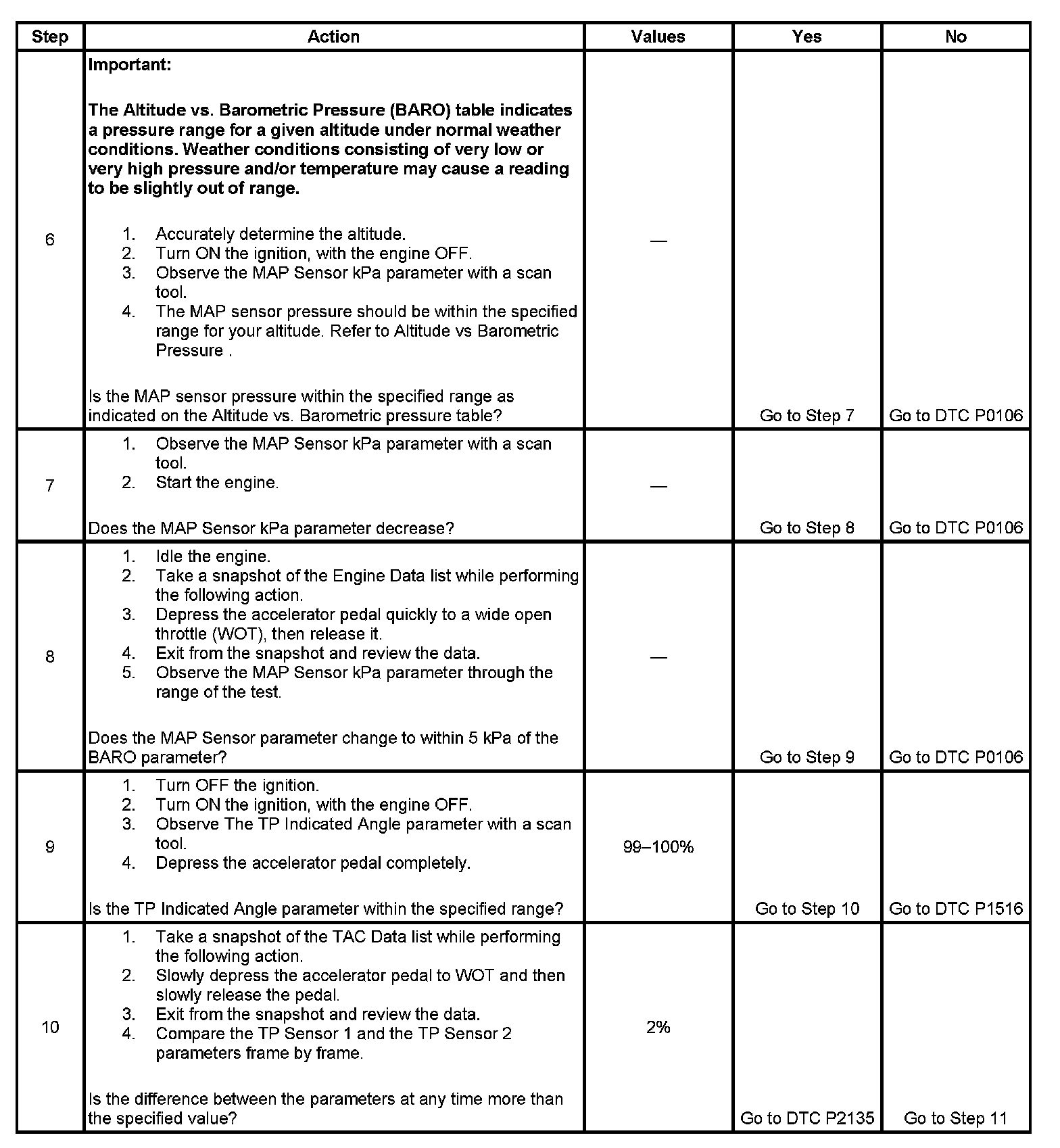 The estimates of MAF and MAP obtained from this system of models and calculations are then compared to the actual measured values from the MAF, MAP, and the TP sensors and to each other to determine the appropriate DTC to fail. The table illustrates the possible failure combinations and the resulting DTC or DTCs.