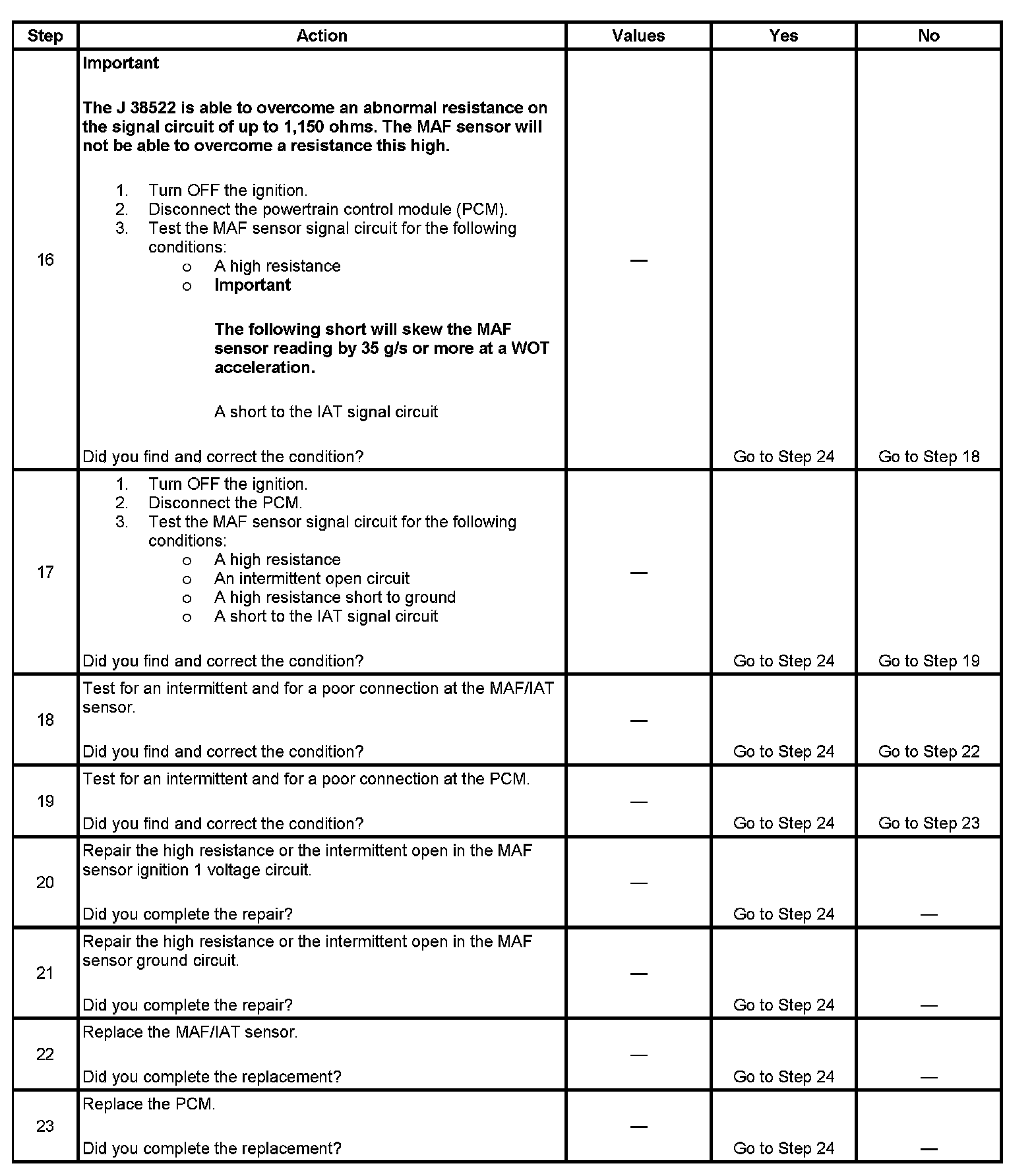 16. This step will determine if an abnormal resistance of less than 1,150 ohms has skewed the MAF sensor frequency signal.