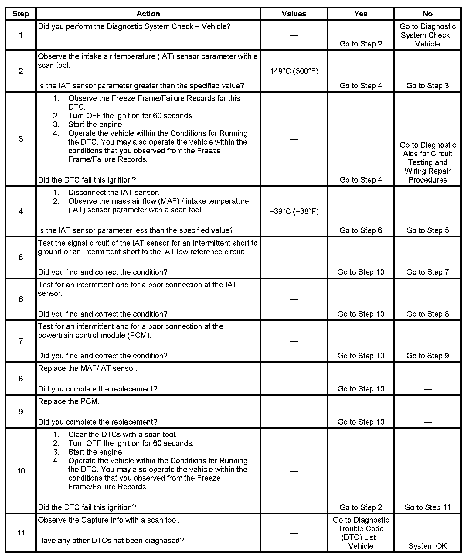 The PCM detects that the IAT sensor parameter is more than 149°C (300°F) intermittently for more than 5 seconds.