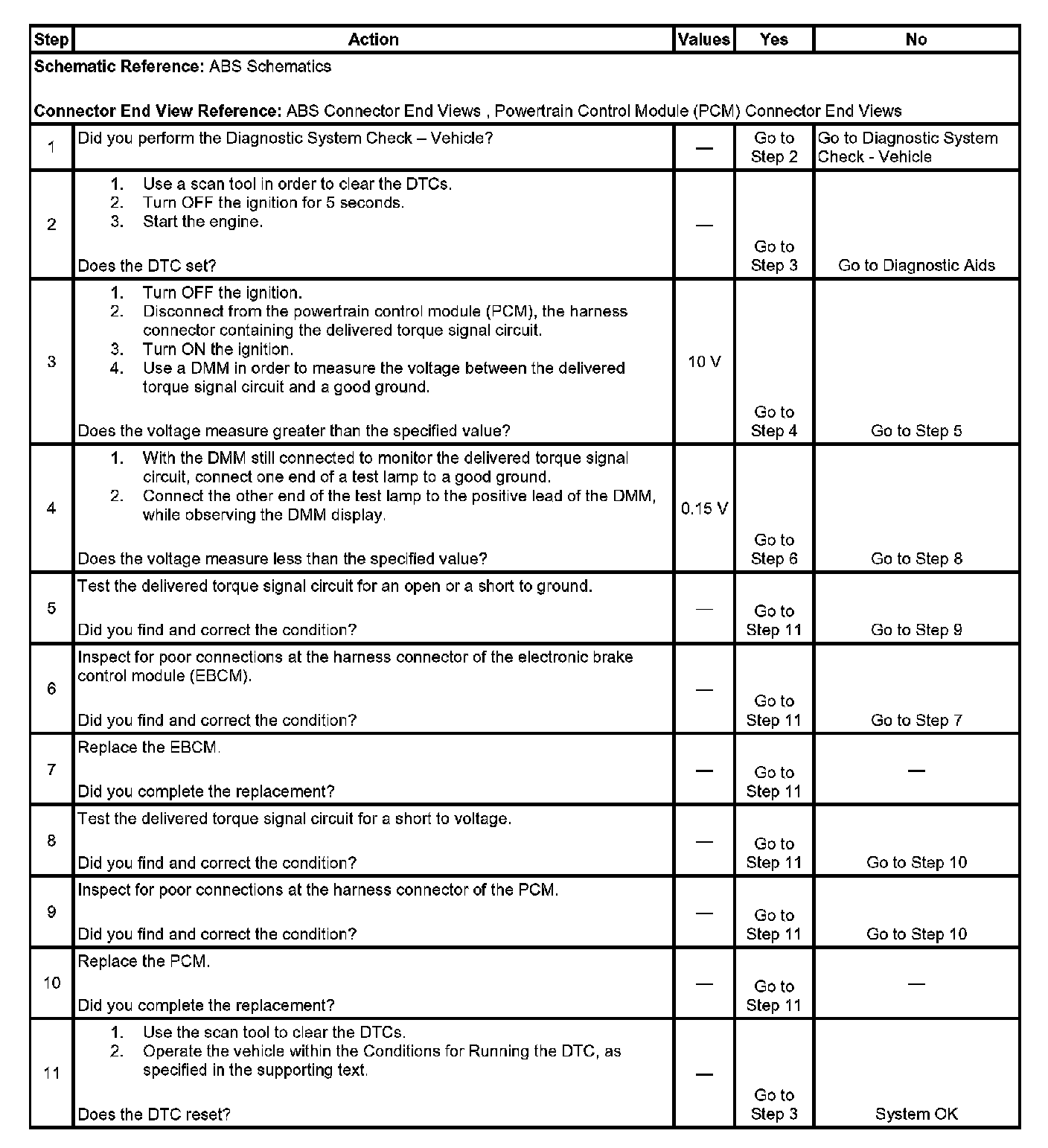The electronic brake control module (EBCM) supplies approximately 12 volts through an internal resistor to the powertrain control module (PCM) on the delivered torque signal circuit. The PCM toggles this voltage to ground in order to create a valid delivered torque signal at the EBCM.