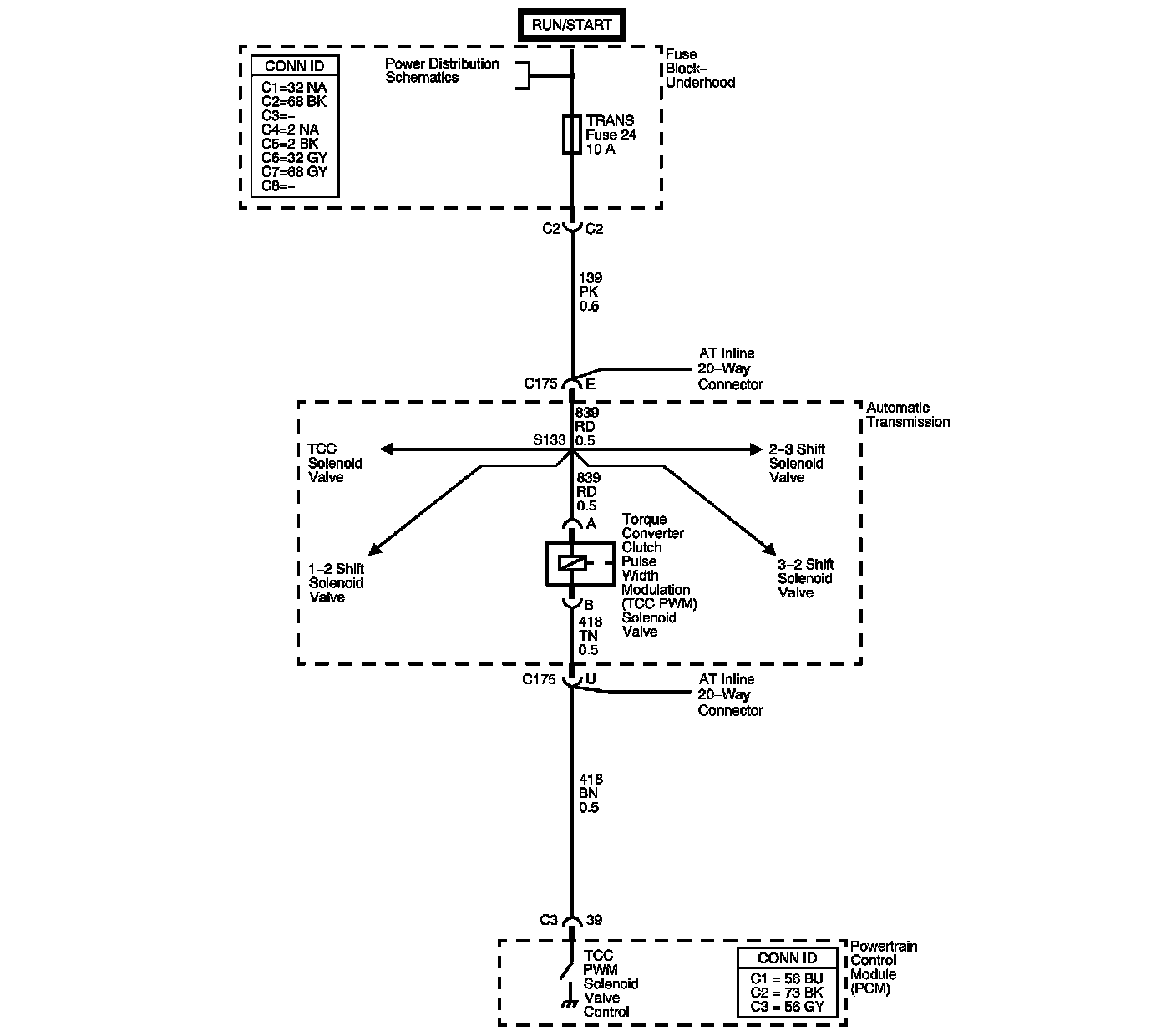 The torque converter clutch pulse width modulation (TCC PWM) solenoid valve controls the fluid acting on the converter clutch valve. The converter clutch valve controls the torque converter clutch (TCC) application and release. The solenoid attaches to the control valve body within the transmission. The solenoid receives ignition voltage through the Ignition 0 voltage circuit. The powertrain control module (PCM) controls the solenoid by providing a ground path on the TCC PWM solenoid valve control circuit. Current flows through the solenoid coil according to the duty cycle, percentage of ON and OFF time. The TCC PWM solenoid valve provides a smooth engagement of the TCC by operating during a duty cycle percent of ON time.