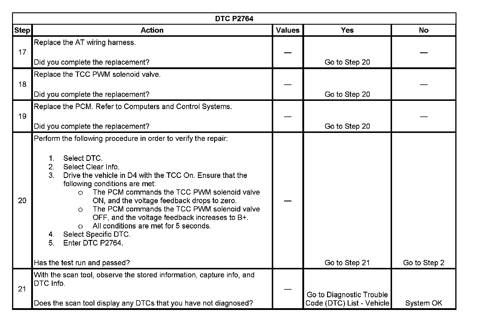 When the PCM detects a continuous open or short to ground in the TCC PWM solenoid valve circuit, then DTC P2764 sets. DTC P2764 is a type B DTC.